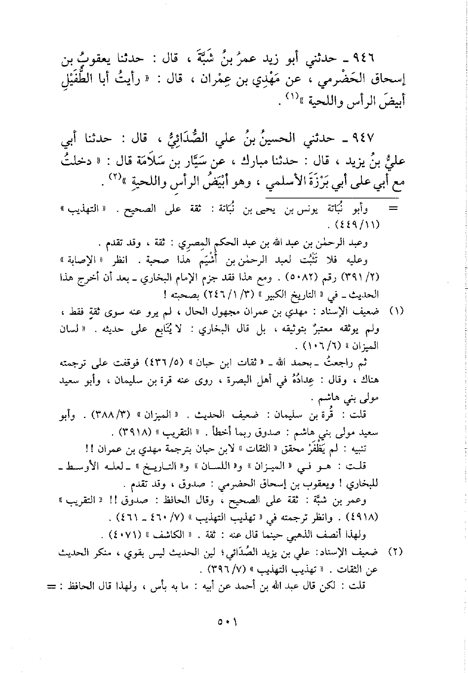 946 - حَدثنِي أَبُو زيد عمر بن شبة، قَالَ: حَدثنَا يَعْقُوب بن إِسْحَاق الْحَضْرَمِيّ، عَن مهْدي بن عمرَان، قَالَ: " رَأَيْت أَبَا الطُّفَيْل أَبيض الرَّأْس واللحية ".