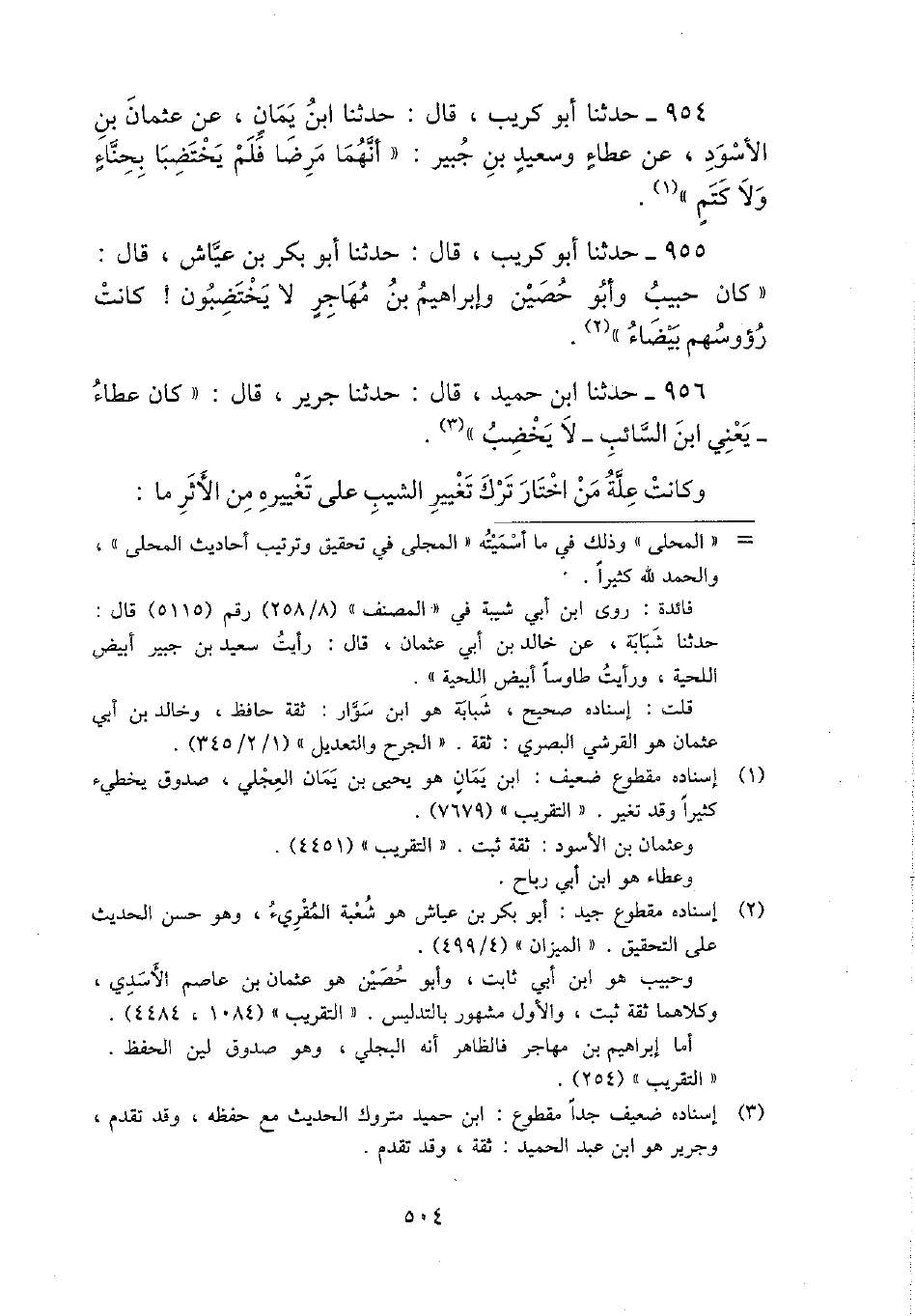 955 - حَدثنَا أَبُو كريب، قَالَ: حَدثنَا أَبُو بكر بن عَيَّاش، قَالَ: " كَانَ حبيب وَأَبُو حُصَيْن وَإِبْرَاهِيم بن مهَاجر لَا يختضبون! كَانَت رؤوسهم بَيْضَاء ".