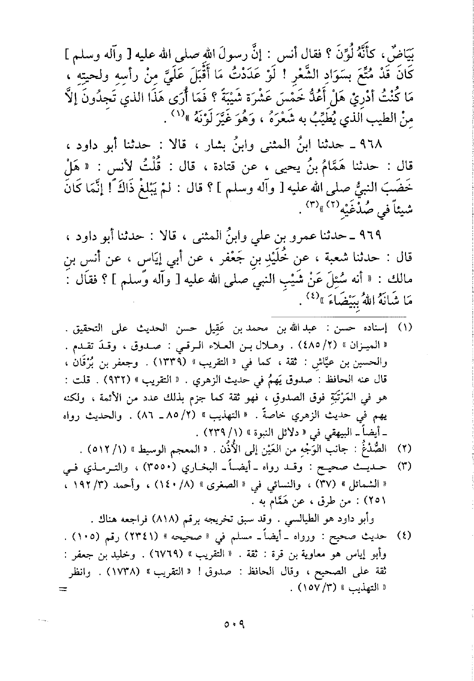 968 - حَدثنَا ابْن الْمثنى وَابْن بشار، قَالَا: حَدثنَا أَبُو دَاوُد، قَالَ: حَدثنَا همام بن يحيى، عَن قَتَادَة، قَالَ: قلت لأنس: " هَل خضب النَّبِي - صَلَّى اللَّهُ عَلَيْهِ وَسَلَّم َ -؟ قَالَ: لم يبلغ ذَاك} إِنَّمَا كَانَ شَيْئا فِي صدغيه ".