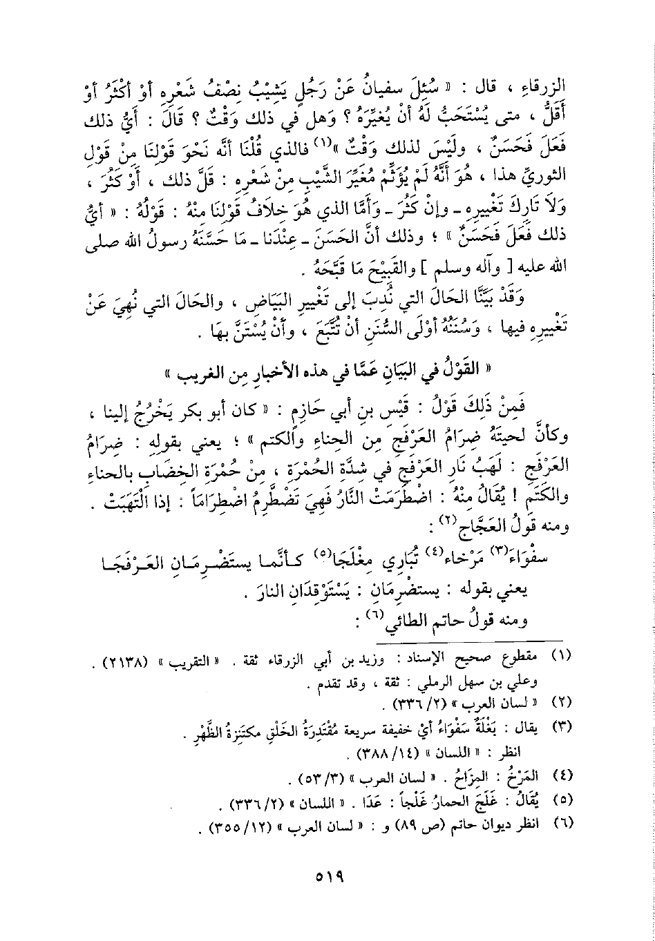 الزَّرْقَاء، قَالَ: " سُئِلَ سُفْيَان عَن رجل يشيب نصف شعره أَو أَكثر أَو أقل، مَتى يسْتَحبّ لَهُ أَن يُغَيِّرهُ؟ وَهل فِي ذَلِك وَقت؟ قَالَ: أَي ذَلِك فعل فَحسن، وَلَيْسَ لذَلِك وَقت " فَالَّذِي قُلْنَا أَنه نَحْو قَوْلنَا من قَول الثَّوْريّ هَذَا، هُوَ أَنه لم يؤثم مغير الشيب من شعره: قل ذَلِك، أَو كثر، وَلَا تَارِك تَغْيِيره - وَإِن كثر - وَأما الَّذِي هُوَ خلاف قَوْلنَا مِنْهُ: قَوْله: " أَي ذَلِك فعل فَحسن "؛ وَذَلِكَ أَن الْحسن - عندنَا - مَا حسنه رَسُول الله - صَلَّى اللَّهُ عَلَيْهِ وَسَلَّم َ - والقبيح مَا قبحه.