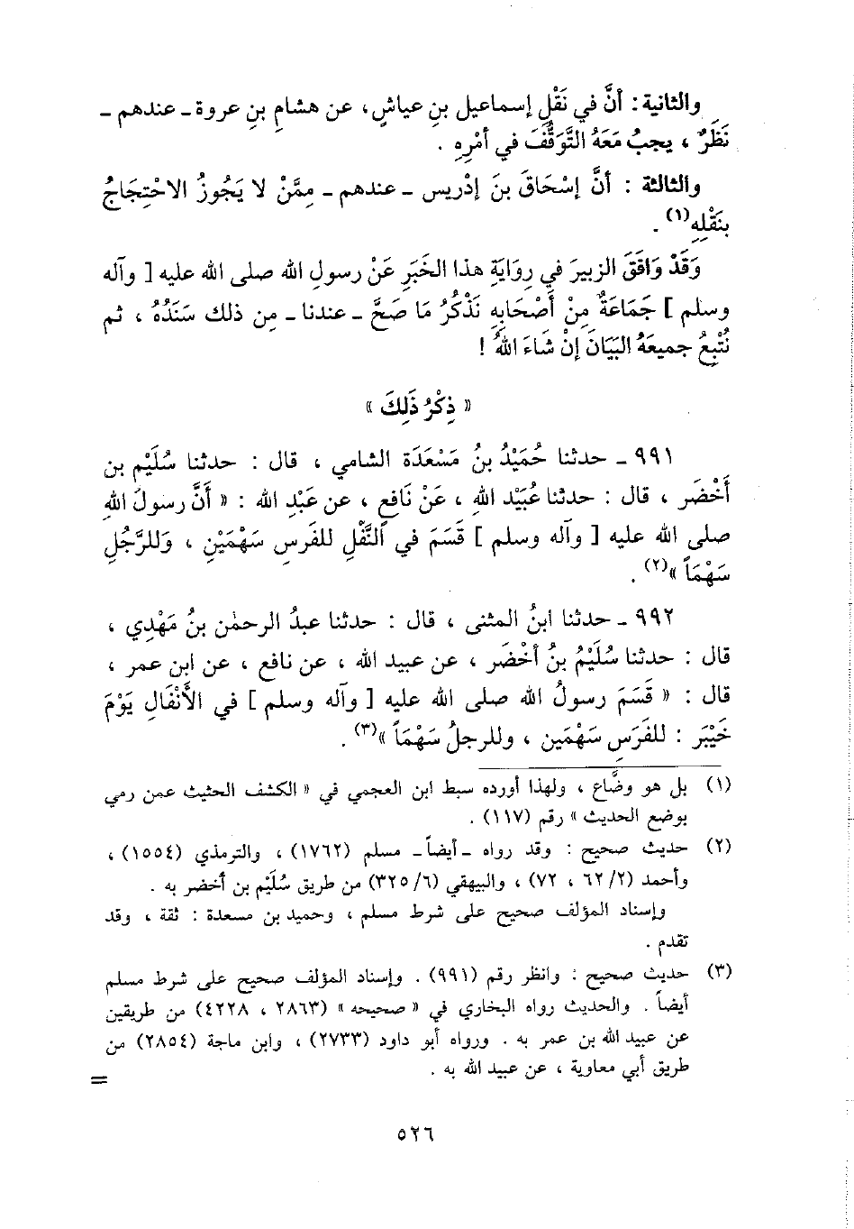991 - حَدثنَا حميد بن مسْعدَة الشَّامي، قَالَ: حَدثنَا سليم بن أَخْضَر، قَالَ: حَدثنَا عبيد الله، عَن نَافِع، عَن عبد الله: " أَن رَسُول الله - صَلَّى اللَّهُ عَلَيْهِ وَسَلَّم َ - قسم فِي النَّفْل للْفرس سَهْمَيْنِ، وللرجل سَهْما ".