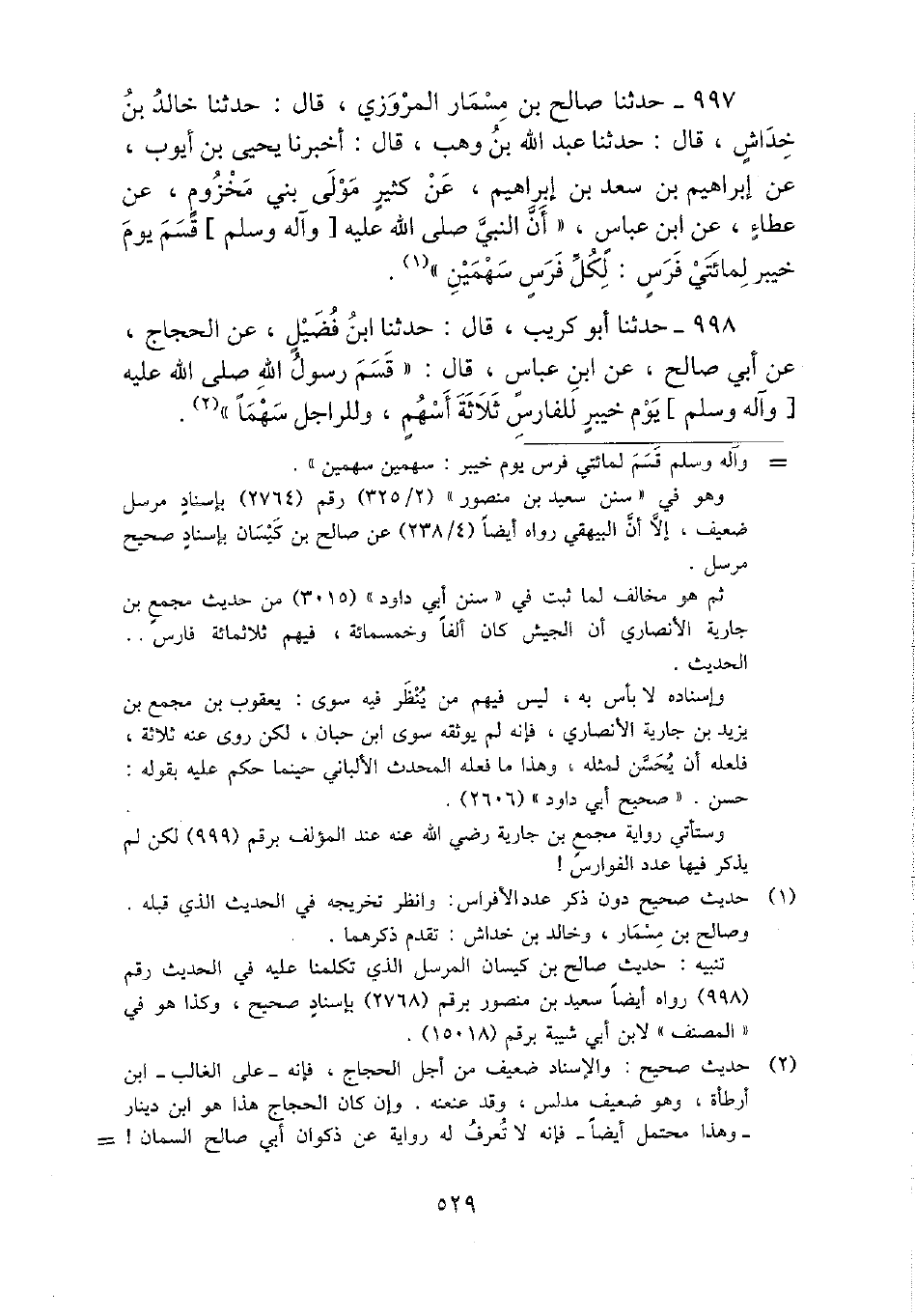 997 - حَدثنَا صَالح بن مِسْمَار الْمروزِي، قَالَ: حَدثنَا خَالِد بن خِدَاش، قَالَ: حَدثنَا عبد الله بن وهب، قَالَ: أخبرنَا يحيى بن أَيُّوب، عَن إِبْرَاهِيم بن سعد بن إِبْرَاهِيم، عَن كثير مولى بني مَخْزُوم، عَن عَطاء، عَن ابْن عَبَّاس، " أَن النَّبِي - صَلَّى اللَّهُ عَلَيْهِ وَسَلَّم َ - قسم يَوْم خَيْبَر لمائتي فرس: لكل فرس سَهْمَيْنِ ".