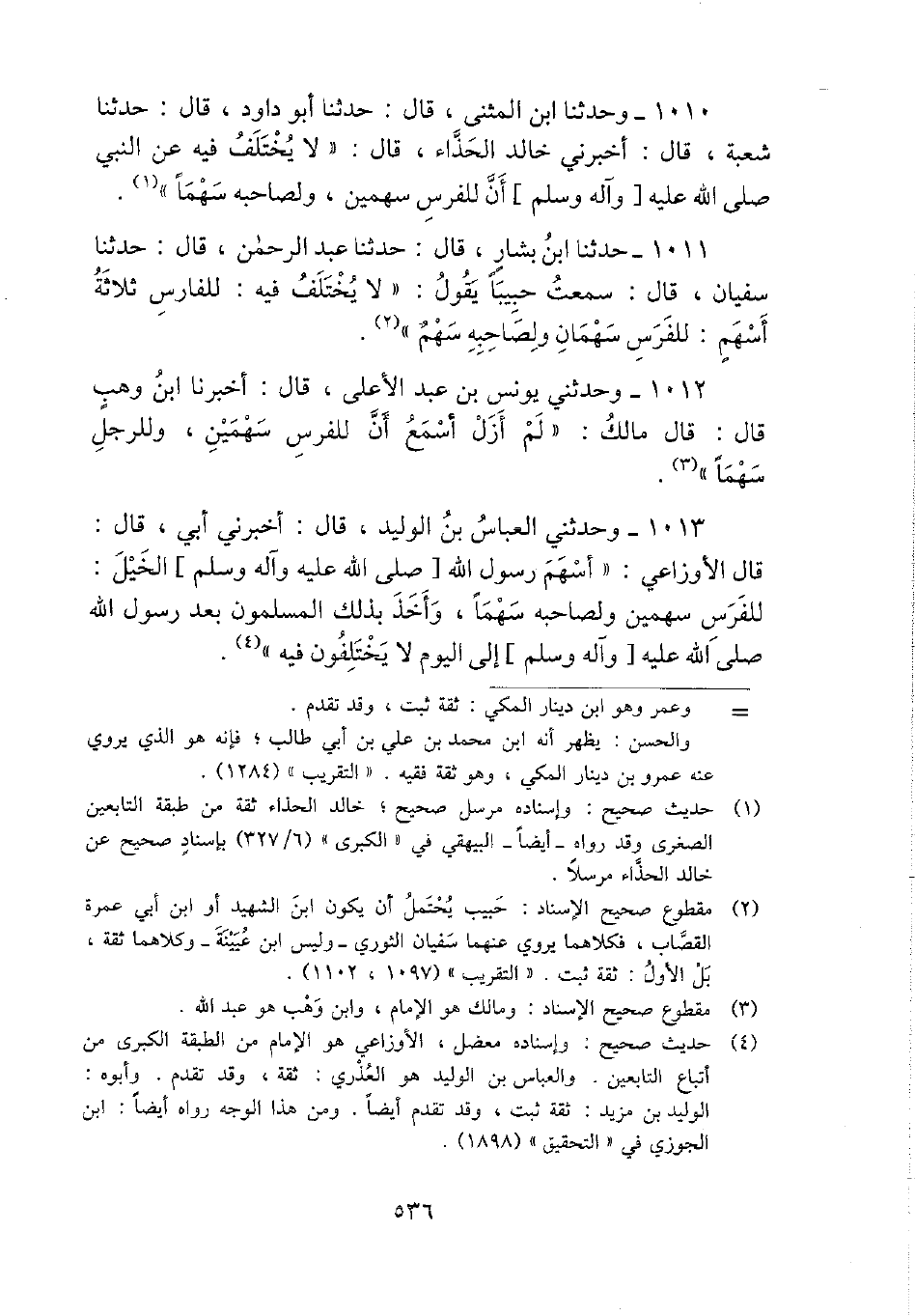1013 - وحَدثني الْعَبَّاس بن الْوَلِيد، قَالَ: أَخْبرنِي أبي، قَالَ: قَالَ الْأَوْزَاعِيّ: " أسْهم رَسُول الله - صَلَّى اللَّهُ عَلَيْهِ وَسَلَّم َ - الْخَيل: للْفرس سَهْمَيْنِ ولصاحبه سَهْما، وَأخذ بذلك الْمُسلمُونَ بعد رَسُول الله - صَلَّى اللَّهُ عَلَيْهِ وَسَلَّم َ - إِلَى الْيَوْم لَا يَخْتَلِفُونَ فِيهِ ".