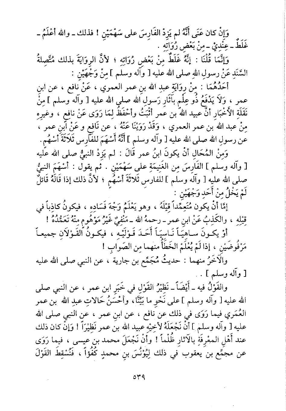 وَمن الْمحَال أَن يكون ابْن عمر قَالَ: لم يزدْ النَّبِي - صَلَّى اللَّهُ عَلَيْهِ وَسَلَّم َ - الْفَارِس من الْغَنِيمَة على سَهْمَيْنِ. ثمَّ يَقُول: أسْهم النَّبِي - صَلَّى اللَّهُ عَلَيْهِ وَسَلَّم َ - للفارس ثَلَاثَة أسْهم؛ لِأَن ذَلِك إِذا قَالَه قَائِل لم يخل من أحد وَجْهَيْن: