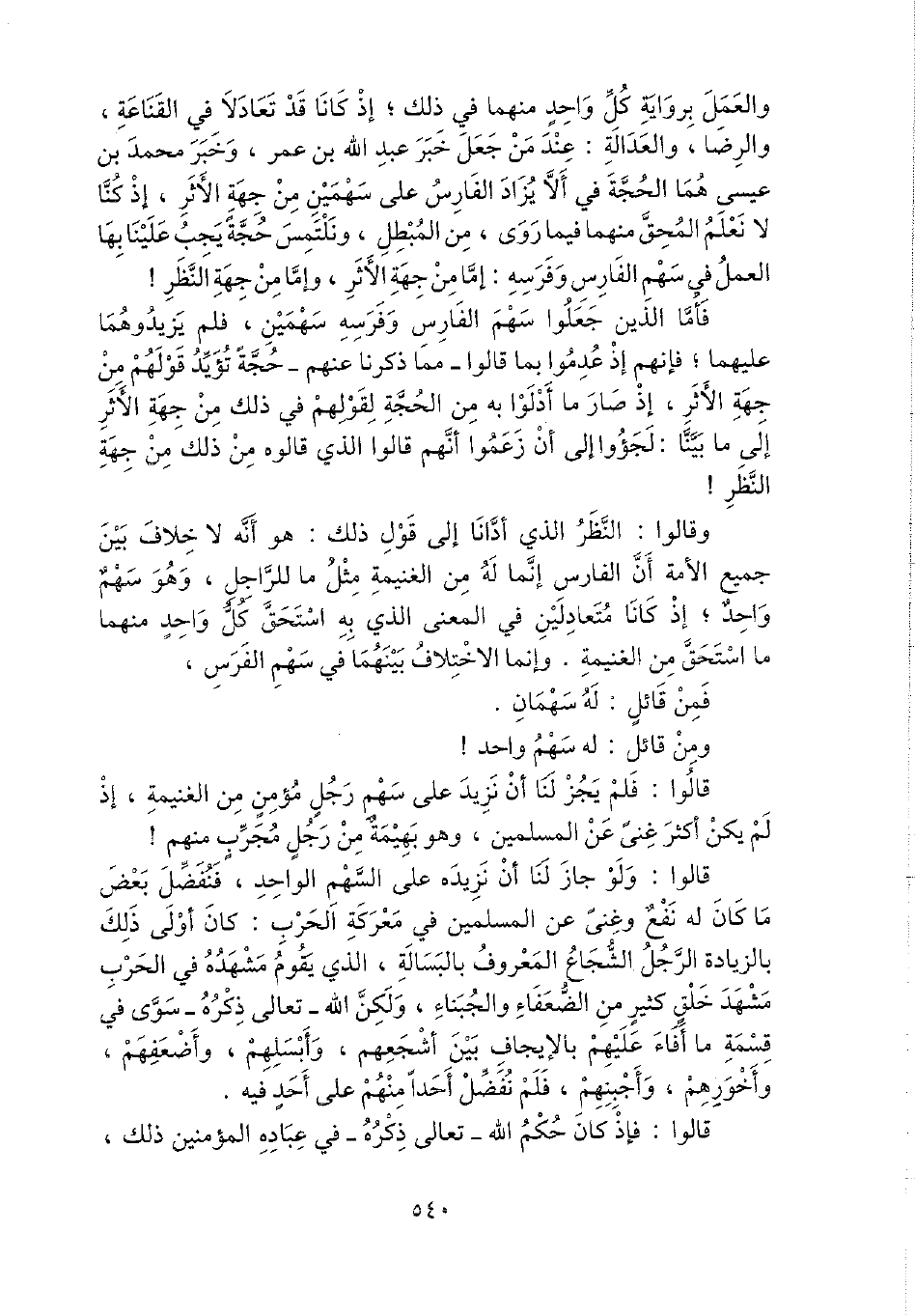 وَالْعَمَل بِرِوَايَة كل وَاحِد مِنْهُمَا فِي ذَلِك؛ إِذْ كَانَا قد تعادلا فِي القناعة، وَالرِّضَا، وَالْعَدَالَة: عِنْد من جعل خبر عبد الله بن عمر، وَخبر مُحَمَّد بن عِيسَى هما الْحجَّة فِي أَلا يُزَاد الْفَارِس على سَهْمَيْنِ من جِهَة الْأَثر، إِذْ كُنَّا لَا نعلم المحق مِنْهُمَا فِيمَا روى، من الْمُبْطل، ونلتمس حجَّة يجب علينا بهَا الْعَمَل فِي سهم الْفَارِس وفرسه: إِمَّا من جِهَة الْأَثر، وَإِمَّا من جِهَة النّظر {