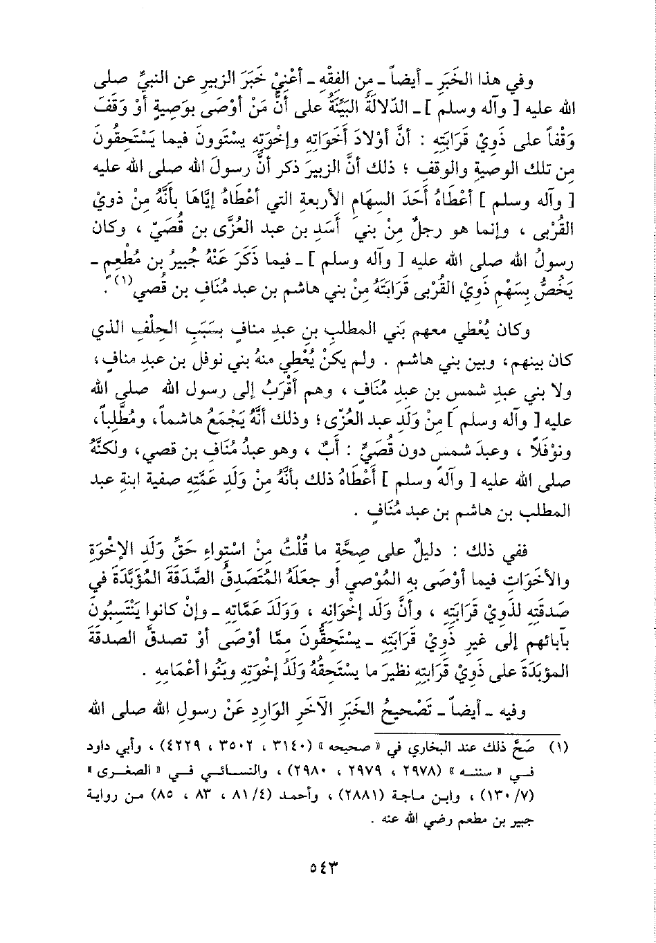 وَفِي هَذَا الْخَبَر - أَيْضا - من الْفِقْه - أَعنِي خبر الزبير عَن النَّبِي - صَلَّى اللَّهُ عَلَيْهِ وَسَلَّم َ - الدّلَالَة الْبَيِّنَة على أَن من أوصى بِوَصِيَّة أَو وقف وَقفا على ذَوي قرَابَته: أَن أَوْلَاد أخواته وَإِخْوَته يستوون فِيمَا يسْتَحقُّونَ من تِلْكَ الْوَصِيَّة وَالْوَقْف؛ ذَلِك أَن الزبير ذكر أَن رَسُول الله - صَلَّى اللَّهُ عَلَيْهِ وَسَلَّم َ - أعطَاهُ أحد السِّهَام الْأَرْبَعَة الَّتِي أعطَاهُ إِيَّاهَا بِأَنَّهُ من ذَوي الْقُرْبَى، وَإِنَّمَا هُوَ رجل من بني أَسد بن عبد الْعُزَّى بن قصي، وَكَانَ رَسُول الله - صَلَّى اللَّهُ عَلَيْهِ وَسَلَّم َ - فِيمَا ذكر عَنهُ جُبَير بن مطعم - يخص بِسَهْم ذَوي الْقُرْبَى قرَابَته من بني هَاشم بن عبد منَاف بن قصي.