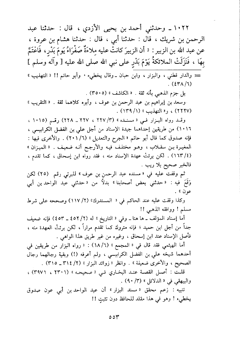 1022 - وحَدثني أَحْمد بن يحيى الْأَزْدِيّ، قَالَ: حَدثنَا عبد الرَّحْمَن بن شريك، قَالَ: حَدثنَا أبي، قَالَ: حَدثنَا هِشَام بن عُرْوَة، عَن عبد الله بن الزبير: " أَن الزبير كَانَت عَلَيْهِ ملاءة صفراء يَوْم بدر، فاعتم بهَا، فَنزلت الْمَلَائِكَة يَوْم بدر على نَبِي الله - صَلَّى اللَّهُ عَلَيْهِ وَسَلَّم َ -