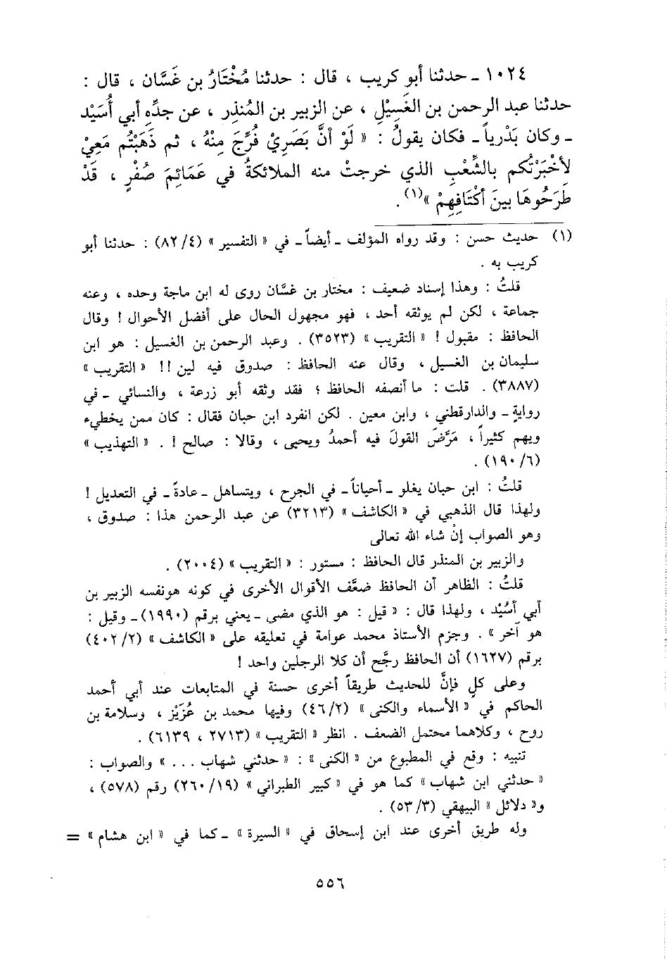 1024 - حَدثنَا أَبُو كريب، قَالَ: حَدثنَا مُخْتَار بن غَسَّان، قَالَ: حَدثنَا عبد الرَّحْمَن بن الغسيل، عَن الزبير بن الْمُنْذر، عَن جده أبي أسيد - وَكَانَ بَدْرِيًّا - فَكَانَ يَقُول: " لَو أَن بَصرِي فرج مِنْهُ، ثمَّ ذهبتم معي لأخبرتكم بِالشعبِ الَّذِي خرجت مِنْهُ الْمَلَائِكَة فِي عمائم صفر، قد طرحوها بَين أكتافهم ".