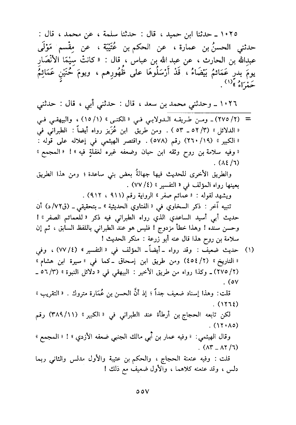 1025 - حَدثنَا ابْن حميد، قَالَ: حَدثنَا سَلمَة، عَن مُحَمَّد، قَالَ: حَدثنِي الْحسن بن عمَارَة، عَن الحكم بن عتيبة، عَن مقسم مولى عبد الله بن الْحَارِث، عَن عبد الله بن عَبَّاس، قَالَ: " كَانَت سِيمَا الْأَنْصَار يَوْم بدر عمائم بَيْضَاء، قد أرسلوها على ظُهُورهمْ، وَيَوْم حنين عمائم حَمْرَاء ".