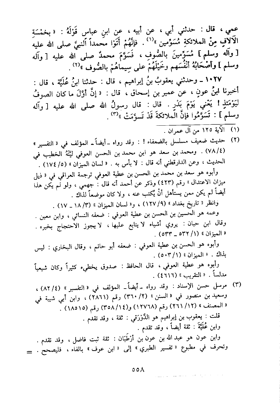عمي، قَالَ: حَدثنِي أبي، عَن أَبِيه، عَن ابْن عَبَّاس قَوْله: " بِخَمْسَة الآلاف من الْمَلَائِكَة مسومين ". فَإِنَّهُم أَتَوا مُحَمَّدًا النَّبِي - صَلَّى اللَّهُ عَلَيْهِ وَسَلَّم َ - مسومين بالصوف، فسوم مُحَمَّد - صَلَّى اللَّهُ عَلَيْهِ وَسَلَّم َ - وَأَصْحَابه أنفسهم وخيلهم على سِيمَاهُمْ بالصوف ".