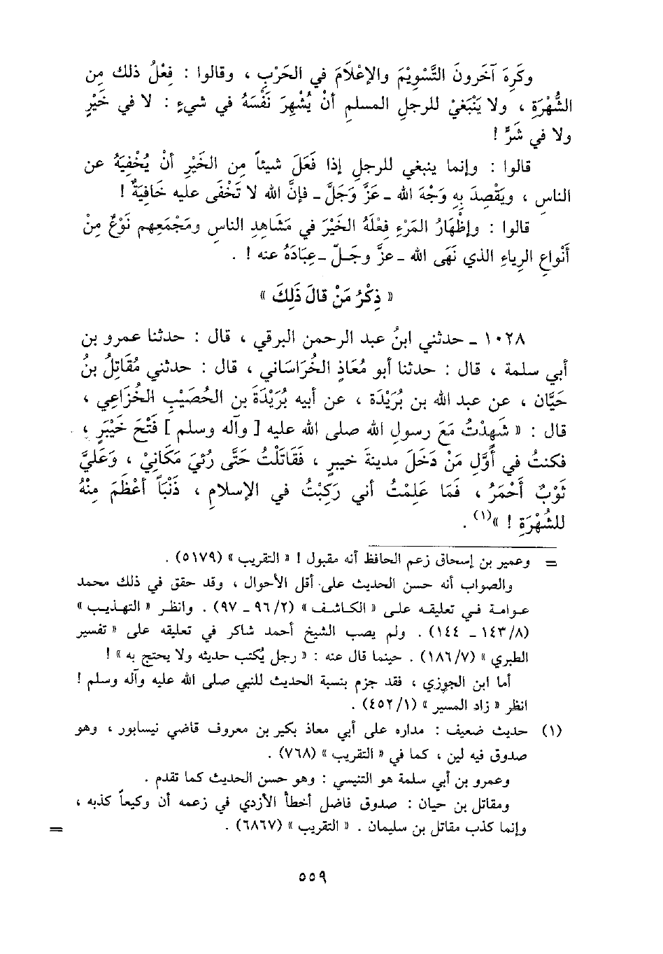 1028 - حَدثنِي ابْن عبد الرَّحْمَن البرقي، قَالَ: حَدثنَا عَمْرو بن أبي سَلمَة، قَالَ: حَدثنَا أَبُو معَاذ الْخُرَاسَانِي، قَالَ: حَدثنِي مقَاتل بن حَيَّان، عَن عبد الله بن بُرَيْدَة، عَن أَبِيه بُرَيْدَة بن الْحصيب الْخُزَاعِيّ، قَالَ: " شهِدت مَعَ رَسُول الله - صَلَّى اللَّهُ عَلَيْهِ وَسَلَّم َ - فتح خَيْبَر، فَكنت فِي أول من دخل مَدِينَة خَيْبَر، فقاتلت حَتَّى رئي مَكَاني، وَعلي ثوب أَحْمَر، فَمَا علمت أَنِّي ركبت فِي الْإِسْلَام، ذَنبا أعظم مِنْهُ للشهرة} ".