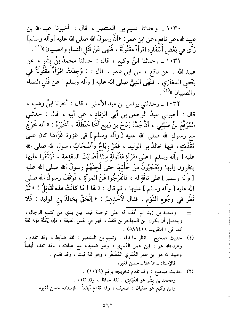 1031 - وَحدثنَا ابْن وَكِيع، قَالَ: حَدثنَا مُحَمَّد بن بشر، عَن عبيد الله، عَن نَافِع، عَن ابْن عمر، قَالَ: " وجدت امْرَأَة مقتولة فِي بعض الْمَغَازِي، فَنهى النَّبِي - صَلَّى اللَّهُ عَلَيْهِ وَسَلَّم َ - عَن قتل النِّسَاء وَالصبيان ".