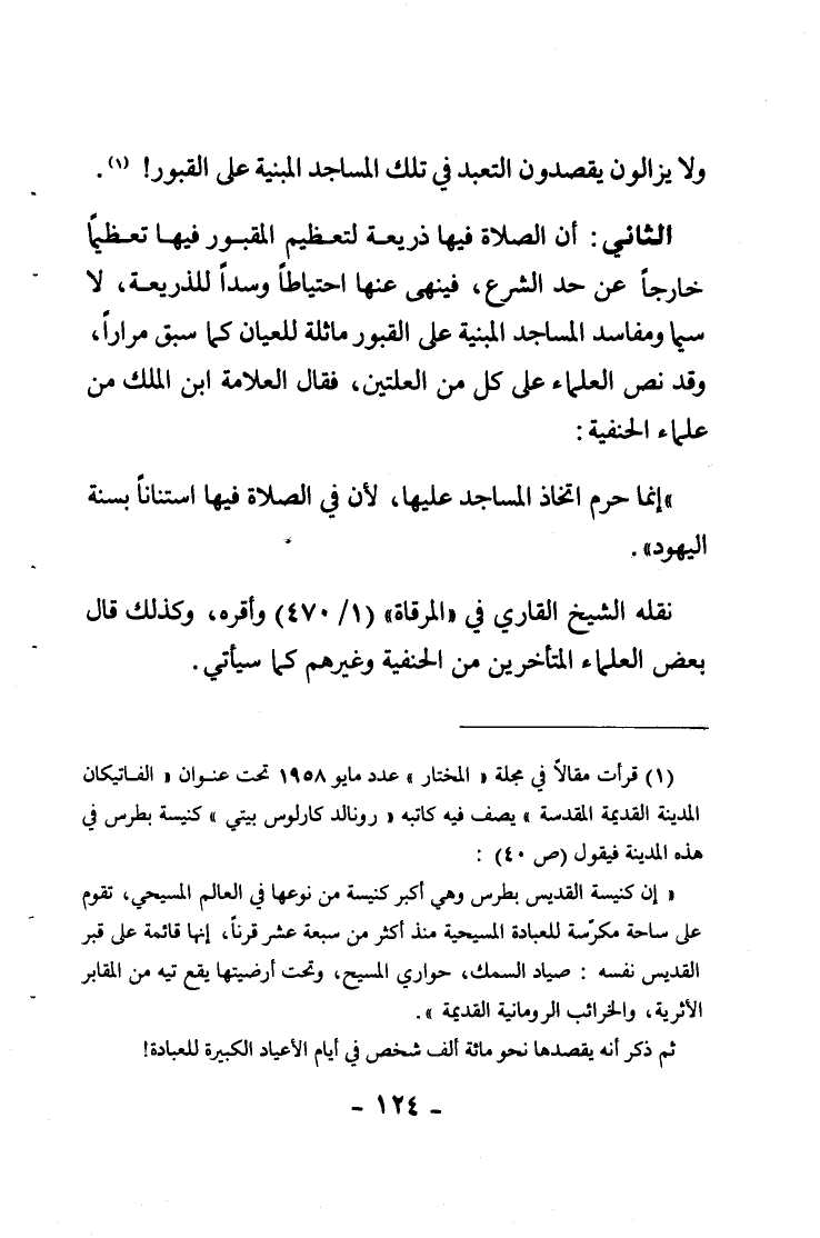 قلت: والوجه الثاني هو الذي رجحه في " الاختيارات العلمية " فقال (ص 25) : " وليس في كلام أحمد وعامة أصحابه هذا الفرق بل عموم كلامهم وتعليلهم واستدلالهم يوجب منع الصلاة عند قبر واحد من القبور وهو الصواب والمقبرة كل ما قبر فيه لا أنه جمع قبر وقال أصحابنا: وكل ما دخل في اسم المقبرة مما حول القبور لا يصلى فيه فهذا يعين أن المنع يكون متناولا لحرمة القبر المنفرد وفنائه المضاف إليه وذكر الآمدي وغيره أن لا تجوز الصلاة فيه (أي المسجد الذي قبلته إلى القبر) حتى يكون بين الحائط وبين المقبرة حائل آخر وذكر بعضهم أنه منصوص أحمد "
