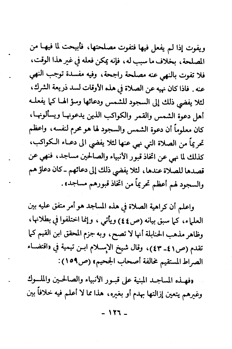واعلم أن كراهة الصلاة في المساجد المبنية على القبور مضطردة في كل حال سواء كان القبر أمامه أو خلفه يمينه أو يساره فالصلاة فيها مكروهة على كل حال ولكن الكراهة تشتد إذا كانت الصلاة إلى القبر لأنه في هذه الحالة ارتكب المصلي مخالفتين الأولى في الصلاة في هذه المساجد والأخرى الصلاة إلى القبر وهي منهي عنها مطلقا سواء كان المسجد أو غير المسجد بالنص الصحيح عن رسول الله A كما تقدم (ص 24)
