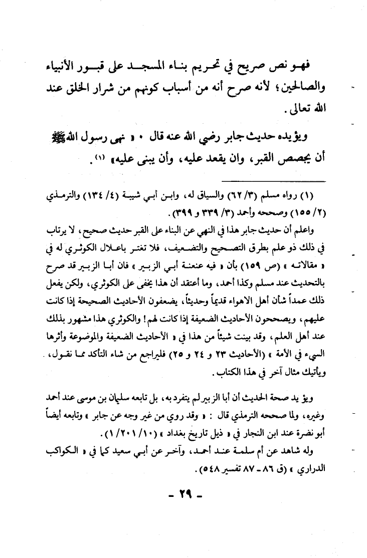 (33) - رواه عبد الرزاق (1591) وهو مرسل صحيح الإسناد وموضع الشاهد منه أن عمرا استشهد بالحديث على النهي عن الصلاة بين القبور فد على أنه يعني المعنى المذكور