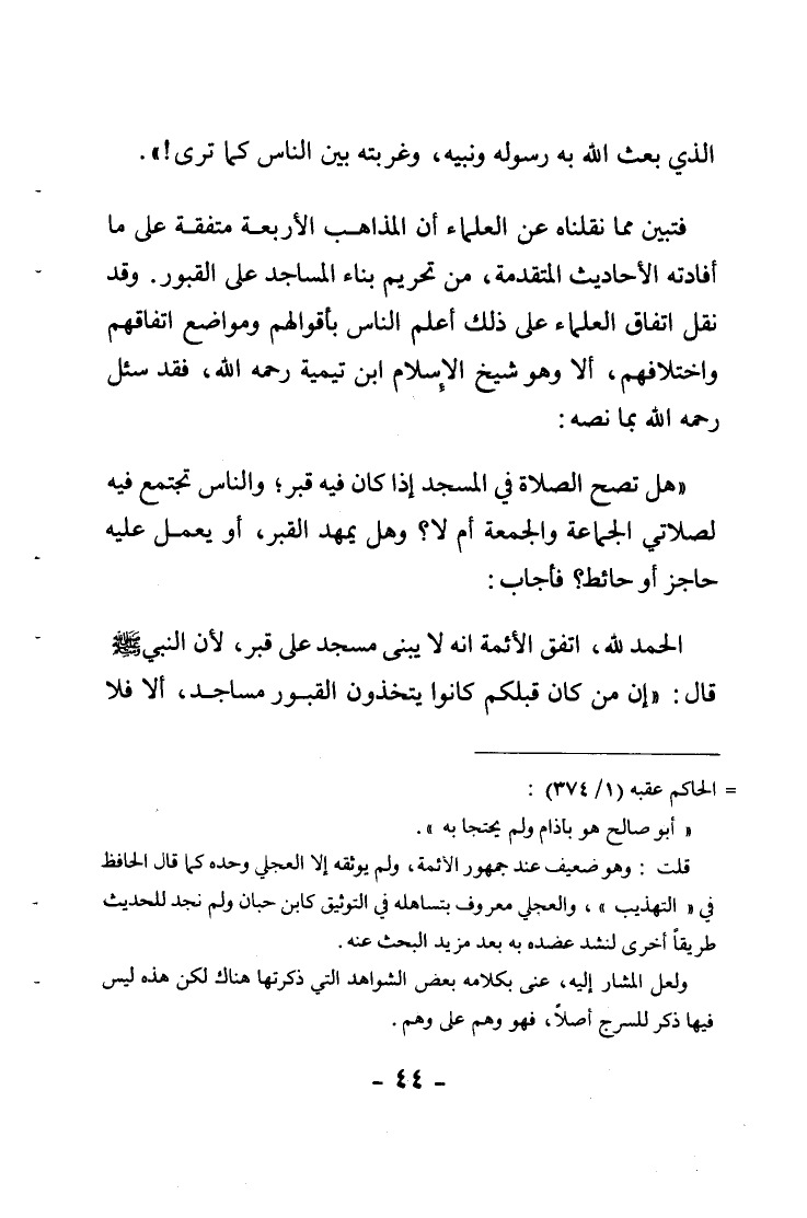 ويؤكد أن هذا المعنى هو المراد من الكراهة في كلام الشافعي في هذه المسألة أن مذهبه أن الأصل في النهي التحريم إلا ما دل الدليل على أنه لمعنى آخر كما صرح بذلك في رسالته " جماع العلم " (ص 125) ونحوه في كتابه " الرسالة " (ص 343) ومن المعلوم لدى كل من درس هذه المسألة بأدلتها أنه لا يوجد أي دليل يصرف النهي الوارد في بعض الأحاديث المتقدمة إلى غير التحريم كيف والأحاديث تؤكد أنه للتحريم كما سبق؟ ولذلك فإني أقطع بأن التحريم هو مذهب الشافعي لا سيما وقد صرح بالكراهة بعد أن ذكر حديث " قاتل الله اليهود والنصارى اتخذوا قبور أنبيائهم مساجد " كما تقدم فلا غرابة إذن إن صرح الحافظ العراقي وهو شافعي المذهب بتحريم بناء المسجد على القبر كما تقدم والله أعلم