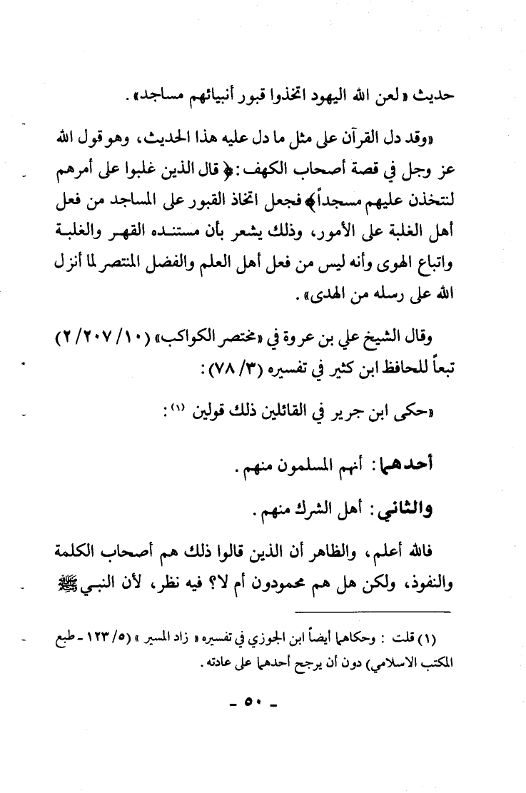 فويسقا وحرق قصر (48) سعد لما احتجب عن الرعية وهم رسول الله A بتحريق بيوت تاركي حضور الجماعة والجمعة (49) وإنما منعه من فيها من النساء والذرية الذين لا تجب عليهم كما أخبر هو عن ذلك (50) . ومنها أن الوقف لا يصح على غير بر ولا قربة كما لم يصح وقف هذا المسجد وعلى هذا فيهدم المسجد إذا بني على قبر كما ينبش الميت إذا دفن في المسجد نص على ذلك الإمام أحمد وغيره فلا يجتمع في دين الإسلام مسجد وقبر بل أيهما طرأ على الآخر منع منه وكان الحكم للسابق فلو وضعا معا لم يجز ولا يصح هذا الوقف ولا يجوز ولا تصح الصلاة في هذا المسجد لنهي رسول الله A عن ذلك ولعنه من اتخذ القبر مسجدا أو أوقد عليه سراجا (51) فهذا دين الإسلام الذي بعث الله به رسوله ونبيه وغربته بين الناس كما ترى "