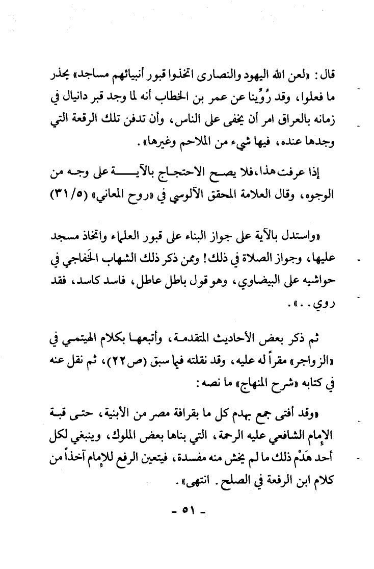 51 - يشيير إلى حديث ابن عباس " لعن الله زائرات القبور والمتخذين عليها المساجد والسرج " رواه أبو داود وغيره ولكنه ضعيف السند وإن لهج بذكره كثير من السلفيين فالحق أحق أن يقال وأن يتبع وممن ضعفه من المتقدمين الإمام مسلم فقال في " كتاب التفصيل ":