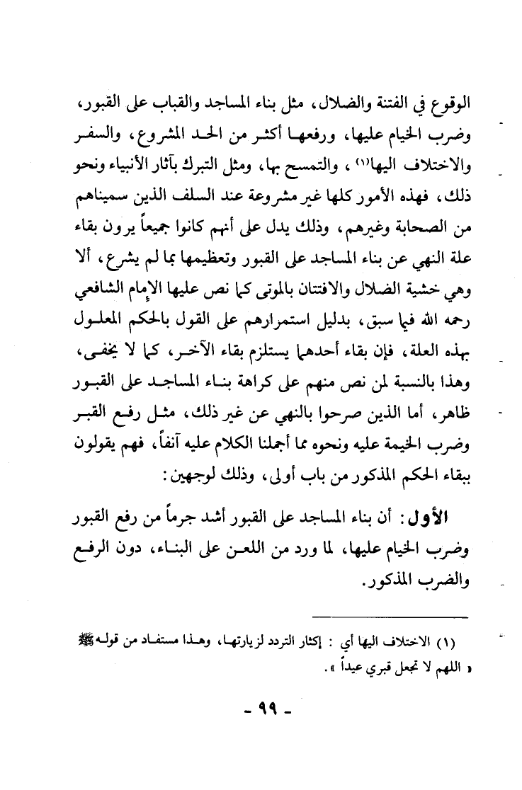 فاقتضت حكمة الإله تبارك وتعالى وقد أرسل محمد ا " A خاتم الرسل وجعل شريعته خاتمه الشرائع أن ينهي عن كل الوسائل التي يخشى أن تكون ذريعة ولو بعد حين لوقوع الناس في الشرك الذي هو أكبرا الكبائر فلذا لك نهى عن بناء المساجد على القبور كما نهى عن شد الرحال إليها واتخاذها أعيادا " (118) (118) - قال: النووي آداب زياره قبره A من كتابه (مناسك الحج) (69 / 2) وهو مخطوط في ظاهريه د مشق (عام 3656) (كره مالك C لأهل المد ينه كلما د خل أحدهم وخرج الوقووف بالقبر قال: وإ نما ذ لك للغرباء قال: ولا بأس لمن قد م من سفر وخرج إلى سفر أن يقف عند قبر النبي A فيصلي عليه ويدعو له ولأبي بكر وعمر Bهما. قال الباجي: فرق مالك بين أهل المدينه والغرباء لأن الغرباء قصد وا ذ لك وأهل المد ينه مقيمون بها وقد قال A: اللهم لا تجعل قبري وثنا " يعبد)