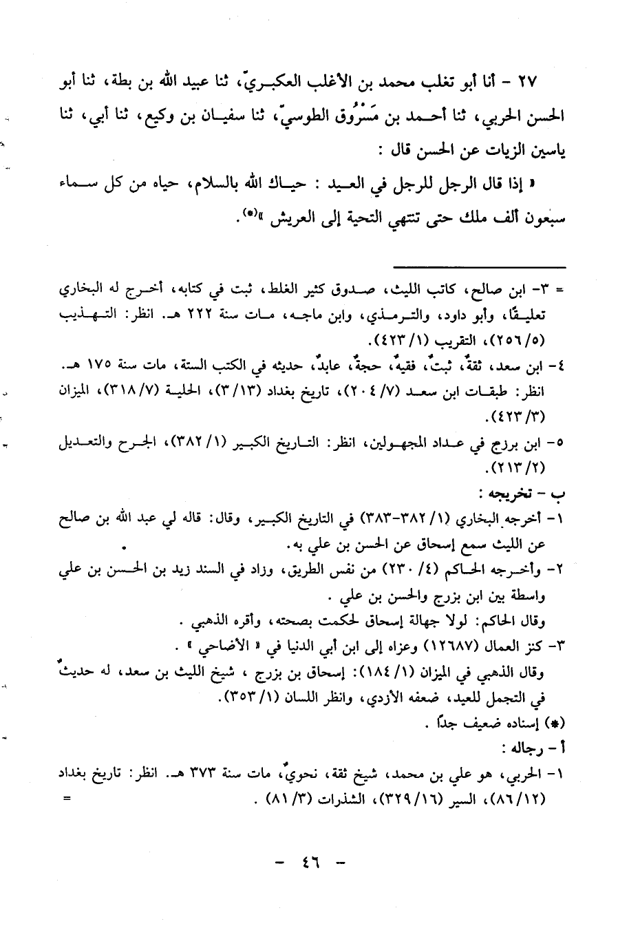 ((إِذَا قَالَ الرَّجُلُ لِلرَّجُلِ فِي الْعِيدِ: حَيَّاكَ اللَّهُ بِالسَّلامِ، حَيَّاهُ مِنَ كُلِّ سَمَاءٍ سَبْعُونَ أَلْفَ مَلَكٍ حتى تنتهي التحية إلى العرش)).