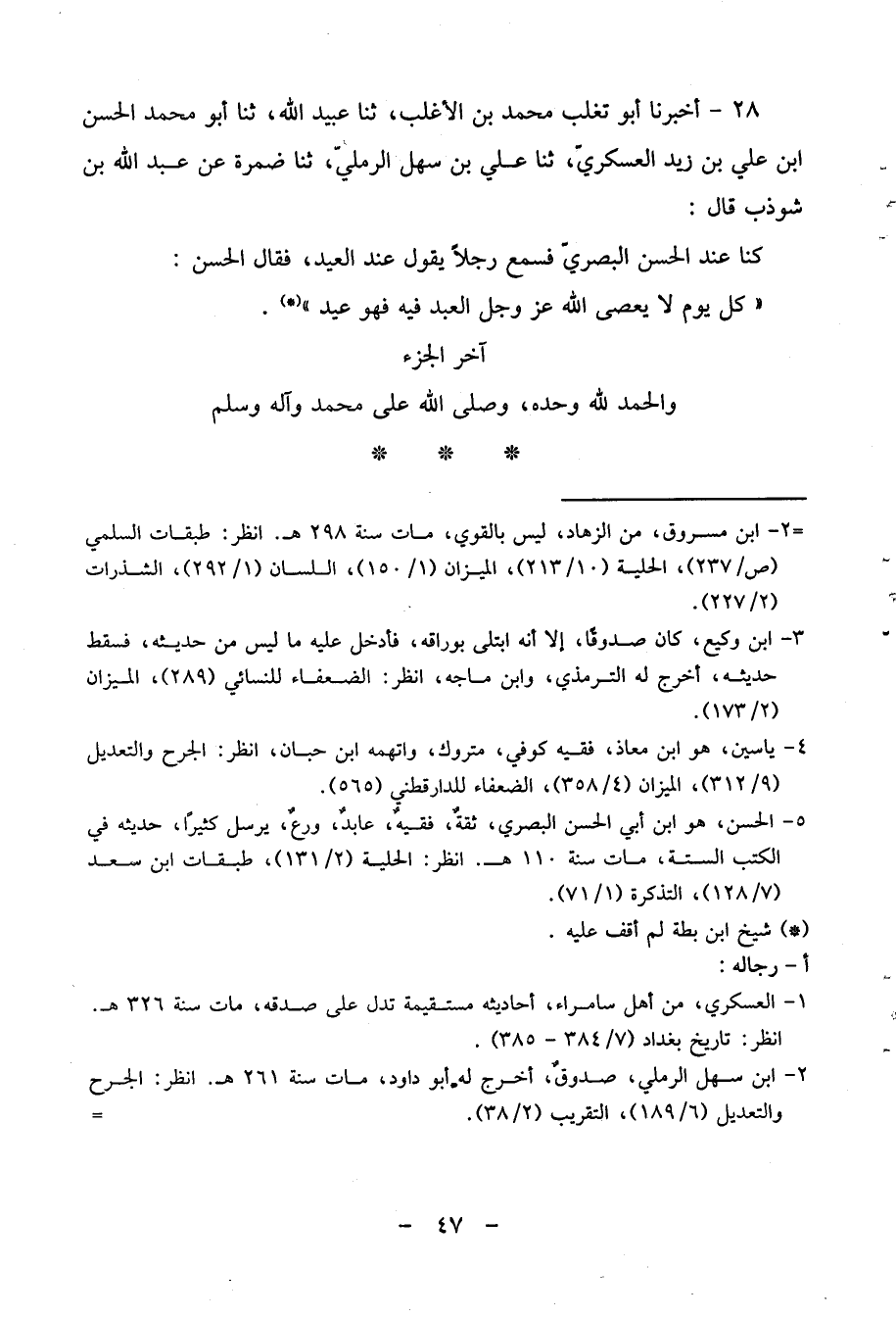 28 - أَخْبَرَنَا أَبُو تَغْلِبَ مُحَمَّدُ بْنُ الأَغْلَبِ، ثنا عُبَيْدُ اللَّهِ، ثنا أَبُو مُحَمَّدٍ الْحَسَنُ بْنُ عَلِيِّ بْنِ زَيْدٍ الْعَسْكَرِيُّ، ثنا عَلِيُّ بْنُ سَهْلٍ الرَّمْلِيُّ، ثنا ضَمْرَةُ عَنْ عَبْدِ اللَّهِ بْنِ شَوْذَبٍ قَالَ: كُنَّا عِنْدَ الْحَسَنِ الْبَصْرِيِّ فَسَمِعَ رَجُلا يَقُولُ عِنْدَ الْعِيدِ، فَقَالَ الْحَسَنُ: