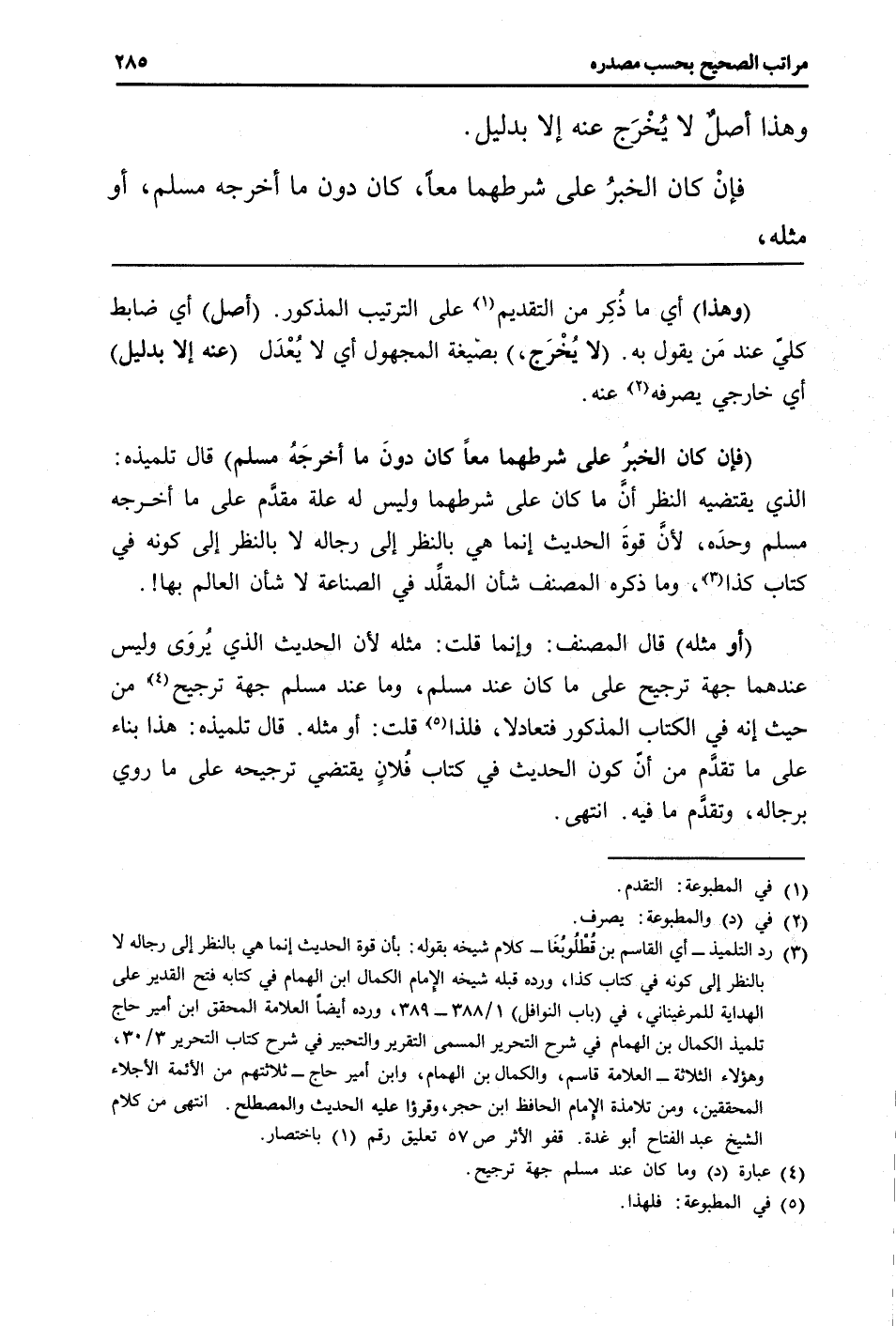 فَإِن كَانَ الْخَبَر على شَرطهمَا مَعًا كَانَ دونَ مَا أخرجهُ مُسلم) قَالَ تِلْمِيذه الَّذِي يَقْتَضِيهِ النّظر أَن مَا كَانَ شَرطهمَا وَلَيْسَ لَهُ عِلّة مقدم على مَا أخرجه مُسلم وحدهَ، لِأَن قُوَّة الحَدِيث إِنَّمَا هِيَ بِالنّظرِ إِلَى رِجَاله لَا بِالنّظرِ إِلَى كَونه فِي كتاب كَذَا، وَمَا ذكره المُصَنّف شَأْن الْمُقَلّد فِي الصِّنَاعَة لَا شَأْن الْعَالم بهَا!