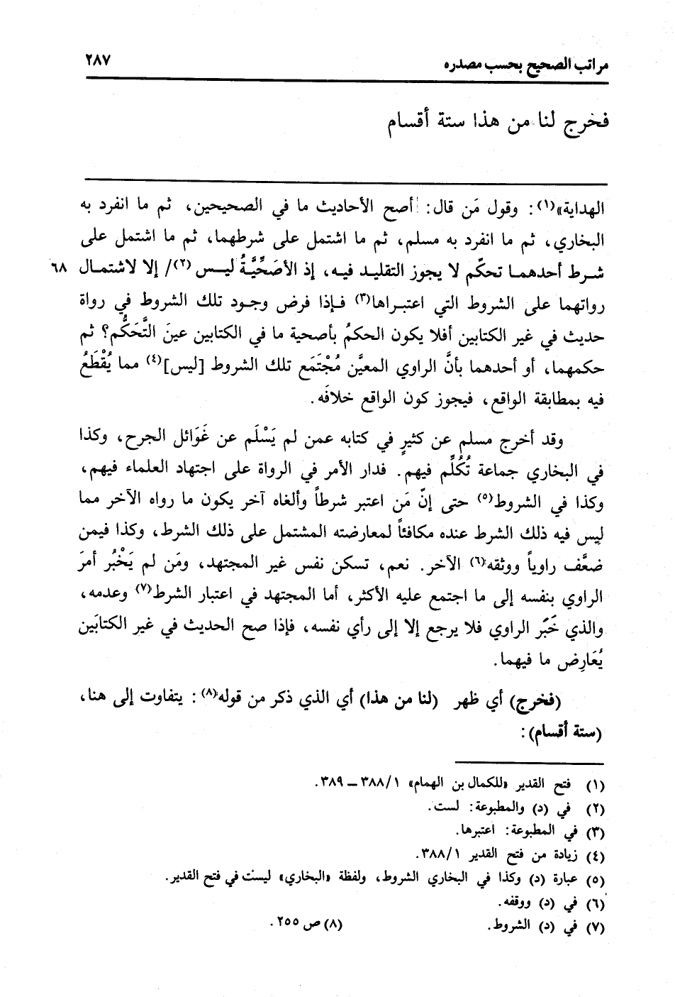 وَقد أخرج مُسلم عَن كثيرٍ فِي كِتَابه عَمَّن لم يسْلَم عَن غَوائل الْجرْح، وَكَذَا فِي البُخَارِيّ جمَاعَة تُكُلم فيهم. فدار الْأَمر فِي الروَاة على اجْتِهَاد الْعلمَاء فيهم، وَكَذَا فِي الشُّرُوط حَتَّى إِن من اعْتبر شرطا وألغاه آخر يكون مَا رَوَاهُ الآخر مِمَّا لَيْسَ فِيهِ ذَلِك الشَّرْط عِنْده مكافئاً لمعارضته الْمُشْتَمل على ذَلِك الشَّرْط، وَكَذَا فِيمَن ضعَّف رَاوِيا وَوَثَّقَهُ الآخر. نعم، تسكن نفس غير الْمُجْتَهد، ومَن لم يَخْبُر أَمر الرَّاوِي بِنَفسِهِ إِلَى مَا اجْتمع عَلَيْهِ الْأَكْثَر، أما الْمُجْتَهد فِي اعْتِبَار الشَّرْط وَعَدَمه، وَالَّذِي خَبَر الرَّاوِي فَلَا يرجع إِلَّا إِلَى رَأْي نَفسه، فَإِذا صَحَّ الحَدِيث فِي غير الْكِتَابَيْنِ يُعارِض مَا فيهمَا.