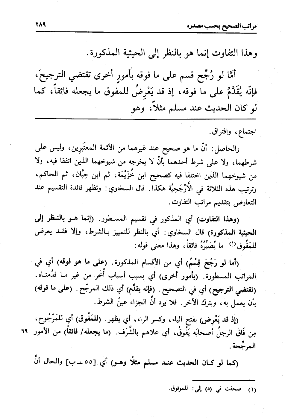 وَالْحَاصِل: أَن مَا هُوَ صَحِيح عِنْد غَيرهمَا من الْأَئِمَّة المعتَبرين، وَلَيْسَ على شَرطهمَا، وَلَا على شَرط أَحدهمَا بِأَن لَا يُخرجهُ من شيوخهما الَّذين اتفقَا فِيهِ، وَلَا من شيوخهما الَّذين اخْتلفَا فِيهِ كصحيح ابْن خزَيْمَة، ثمَّ ابْن حِبان، ثمَّ الْحَاكِم، وترتيب هَذِه الثَّلَاثَة فِي الأرجَحِية هَكَذَا. قَالَ السخاوي: وَتظهر فَائِدَة التَّقْسِيم عِنْد التَّعَارُض بِتَقْدِيم مَرَاتِب التَّفَاوُت.
