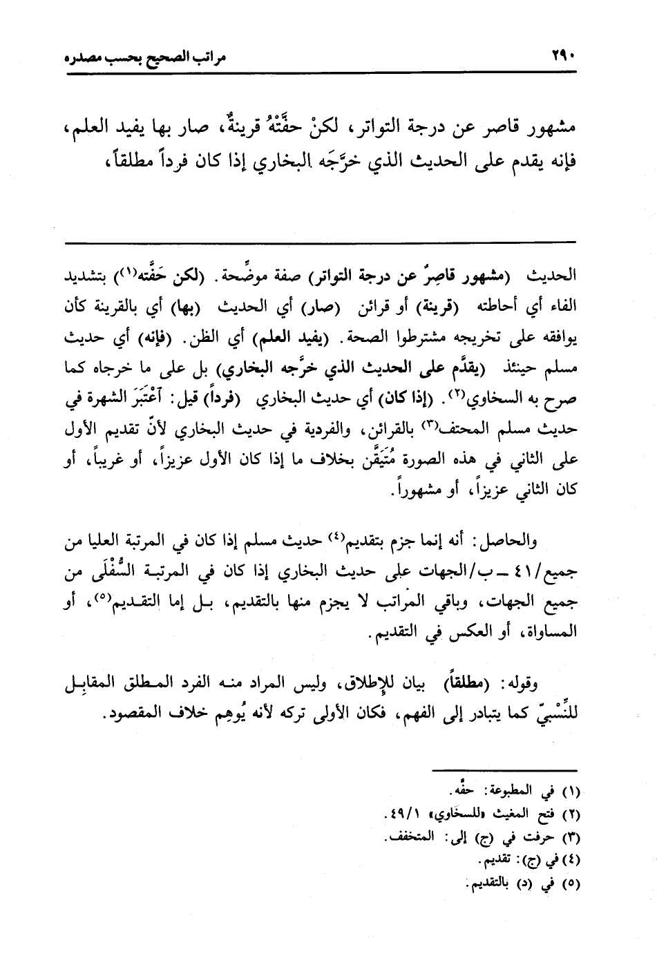 الحَدِيث (مَشْهُور قاصِرٌ عَن دَرَجَة التَّوَاتُر) صفة مُوضحَة. (لَكِن خَفته) بتَشْديد الْفَاء أَي أحاطته (قرينه) أَو قَرَائِن (صَار) أَي الحَدِيث (بهَا) أَي بِالْقَرِينَةِ كَأَن يُوَافقهُ على تَخْرِيجه مشترطوا الصِّحَّة. (يُفِيد الْعلم) أَي الظَّن. (فَإِنَّهُ) أَي حَدِيث مُسلم حِينَئِذٍ (يقدم على الحَدِيث الَّذِي خرجه البُخَارِيّ) بل على مَا خرجاه كَمَا صرح بِهِ السخاوي. (إِذا كَانَ) أَي حَدِيث البُخَارِيّ (فَردا) قيل: اعْتَبَرَ الشُّهْرَة فِي حَدِيث مُسلم المحتف بالقرائن، والفردية فِي حَدِيث البُخَارِيّ لأنّ تَقْدِيم الأول على الثَّانِي فِي هَذِه الصُّورَة مُتيقن بِخِلَاف مَا إِذا كَانَ الأول عَزِيزًا، أَو غَرِيبا أَو كَانَ الثَّانِي عَزِيزًا، أَو مَشْهُورا.