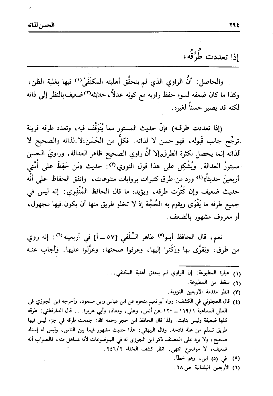 (إِذا تعدّدت طرقه) فَإِن حَدِيث المستور مِمَّا يُتوقف فِيهِ، وتعدد طرقه قرينَة ترجح جَانب قَبوله، فَهُوَ حسن لَا لذاته. فَكل من الحَسَن لَا لذاته وَالصَّحِيح لَا لذاته إِنَّمَا يحصل بِكَثْرَة الطّرق، إِلَّا أَن رَاوِي الصَّحِيح ظَاهر الْعَدَالَة، وراوي الْحسن مَسْتُور الْعَدَالَة. ويُشْكِل على هَذَا قَول النَّوَوِيّ: حَدِيث " من حَفِظَ على أُمّتي أربعينَ حَدِيثا " ورد من طرق كثيرات بروايات متنوعات، وَاتفقَ الْحفاظ على أَنه حَدِيث ضَعِيف وَإِن كَثُرَت طرقه، وَيُؤَيِّدهُ مَا قَالَ الْحَافِظ المُنْذري: إِنَّه لَيْسَ فِي جَمِيع طرقه مَا يَقْوَى وَيقوم بِهِ الحُجة إِذْ لَا تَخْلُو طَرِيق مِنْهَا أَن يكون فِيهَا مَجْهُول، أَو مَعْرُوف مَشْهُور بالضعف.
