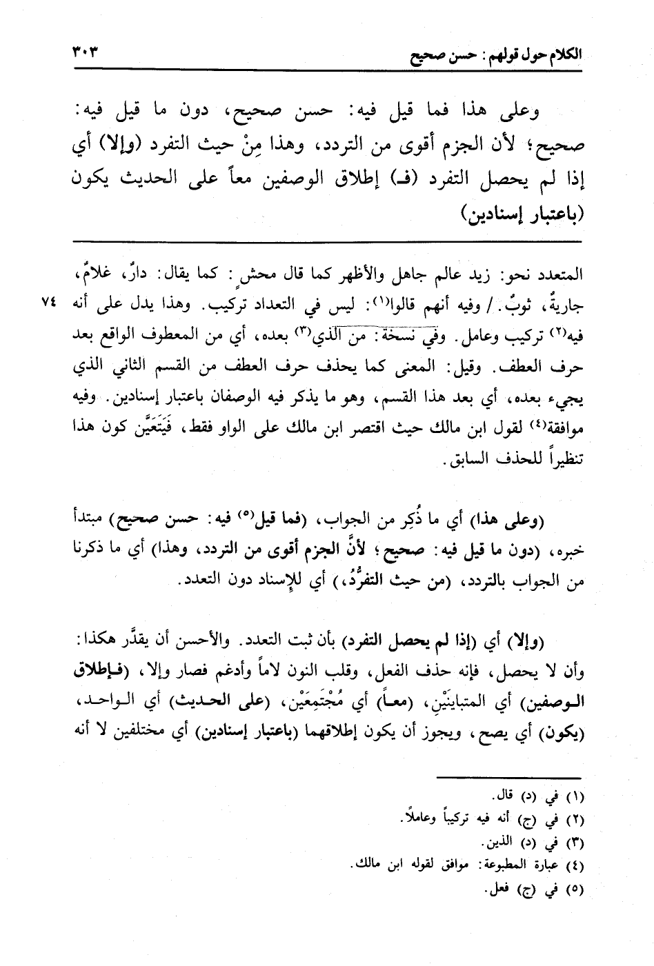 (وعَلى هَذَا) أَي مَا ذُكر من الْجَواب، (فَمَا قيل فِيهِ: حسن صَحِيح) مُبْتَدأ خَبره، (دون مَا قيل فِيهِ: صَحِيح؛ لأنّ الْجَزْم أقوى من التَّرَدُّد، وَهَذَا) أَي مَا ذكرنَا من الْجَواب بالتردد، (من حَيْثُ التفرُد،) أَي للإسناد دون التَّعَدُّد.