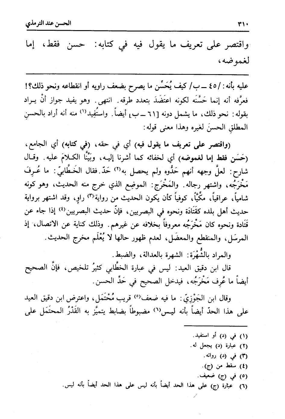 عَلَيْهِ بِأَنَّهُ: / 45 - ب / كَيفَ يُحَسن مَا يُصَرح بِضعْف رَاوِيه أَو انْقِطَاعه وَنَحْو ذَلِك؟ ! فَعرفهُ أَنه إِنَّمَا حَسنة لكَونه اعتضد بِتَعَدُّد طرقه. انْتهى. وَهُوَ يُفِيد جَوَاز أنْ يُرَاد بقوله: نَحْو ذَلِك، مَا يَشْمَل دونه [61 - ب] أَيْضا. واستفيد مِنْهُ أَنه أَرَادَ بالْحسنِ الْمُطلق الحسنَ لغيره وَهَذَا معنى قَوْله: (وَاقْتصر على تَعْرِيف مَا يَقُول فِيهِ) أَي فِي حَقه، (فِي كِتَابه) أَي الْجَامِع، (حَسَن فَقَط إِمَّا لغموضه) أَي لخفائه كَمَا أَشَرنَا إِلَيْهِ، وَبينا الكلامَ عَلَيْهِ. وَقَالَ شَارِح: لَعَلَّ وَجهه أَنهم حَدوه وَلم يحصل بِهِ حَدّ. فَقَالَ الخَطّابيّ: مَا عُرفَ مَخْرَجهُ، واشتهر رِجَاله. والمَخْرج: الموضِع الَّذِي خرج مِنْهُ الحَدِيث، وَهُوَ كَونه شامياً، عراقياً، مكياً، كوفياً كَأَن يكون الحَدِيث من رِوَايَة راوٍ، وَقد اشْتهر بِرِوَايَة حَدِيث أهل بَلَده كقتادة وَنَحْوه فِي الْبَصرِيين، فَإِن حَدِيث الْبَصرِيين إِذا جَاءَ عَن قَتَادَة وَنَحْوه كَانَ مخرجه مَعْرُوفا بِخِلَافِهِ عَن غَيرهم. وَذَلِكَ كِنَايَة عَن الِاتِّصَال، إِذْ المرسَل، والمنقطع والمعضل، لعدم ظُهُور حَالهَا لَا يُعْلم مخرج الحَدِيث. وَالْمرَاد بالشهرة: الشُّهْرَة بِالْعَدَالَةِ، والضبط. قَالَ ابْن دَقِيق الْعِيد: لَيْسَ فِي عبارَة الْخطابِيّ كثير تَلْخِيص، فَإِن الصَّحِيح أَيْضا مَا عُرِف مخرجه، فَيدْخل الصَّحِيح فِي حَد الْحسن.