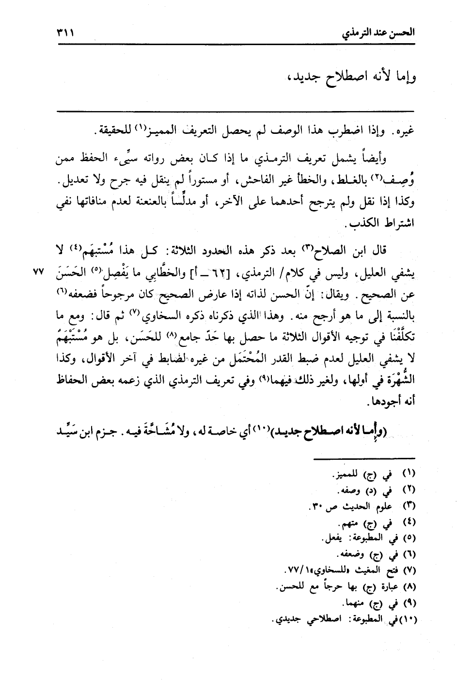 قَالَ ابْن الصّلاح بعد ذكره هَذِه الْحُدُود الثَّلَاثَة: كل هَذَا مُسْتبهم لَا يشفي العليل، وَلَيْسَ فِي كَلَام / التِّرْمِذِيّ، [62 - أ] والخطابي مَا يفصل الحَسَن عَن الصَّحِيح. وَيُقَال: إِن الْحسن لذاته إِذا عَارض الصَّحِيح كَانَ مرجوحاً فضعفه بِالنِّسْبَةِ إِلَى مَا هُوَ أرجح مِنْهُ. وَهَذَا الَّذِي ذَكرْنَاهُ ذكره السخاوي ثمَّ قَالَ: وَمَعَ مَا تكلفنا فِي تَوْجِيه الْأَقْوَال الثَّلَاثَة مَا حصل بهَا حد جَامع لِلْحسنِ، بل هُوَ مُستبهم لَا يشفي العليل لعدم ضبط الْقدر المُحْتمل من غَيره لضابط فِي آخر الْأَقْوَال، وَكَذَا الشُّهْرَة فِي أَولهَا، ولغير ذَلِك فيهمَا وَفِي تَعْرِيف التِّرْمِذِيّ الَّذِي زَعمه بعض الْحفاظ أَنه أَجودهَا. (وَأما لِأَنَّهُ اصْطِلَاح جَدِيد) أَي خَاصَّة لَهُ، وَلَا مُشَاحةً فِيهِ جزم ابْن سيد