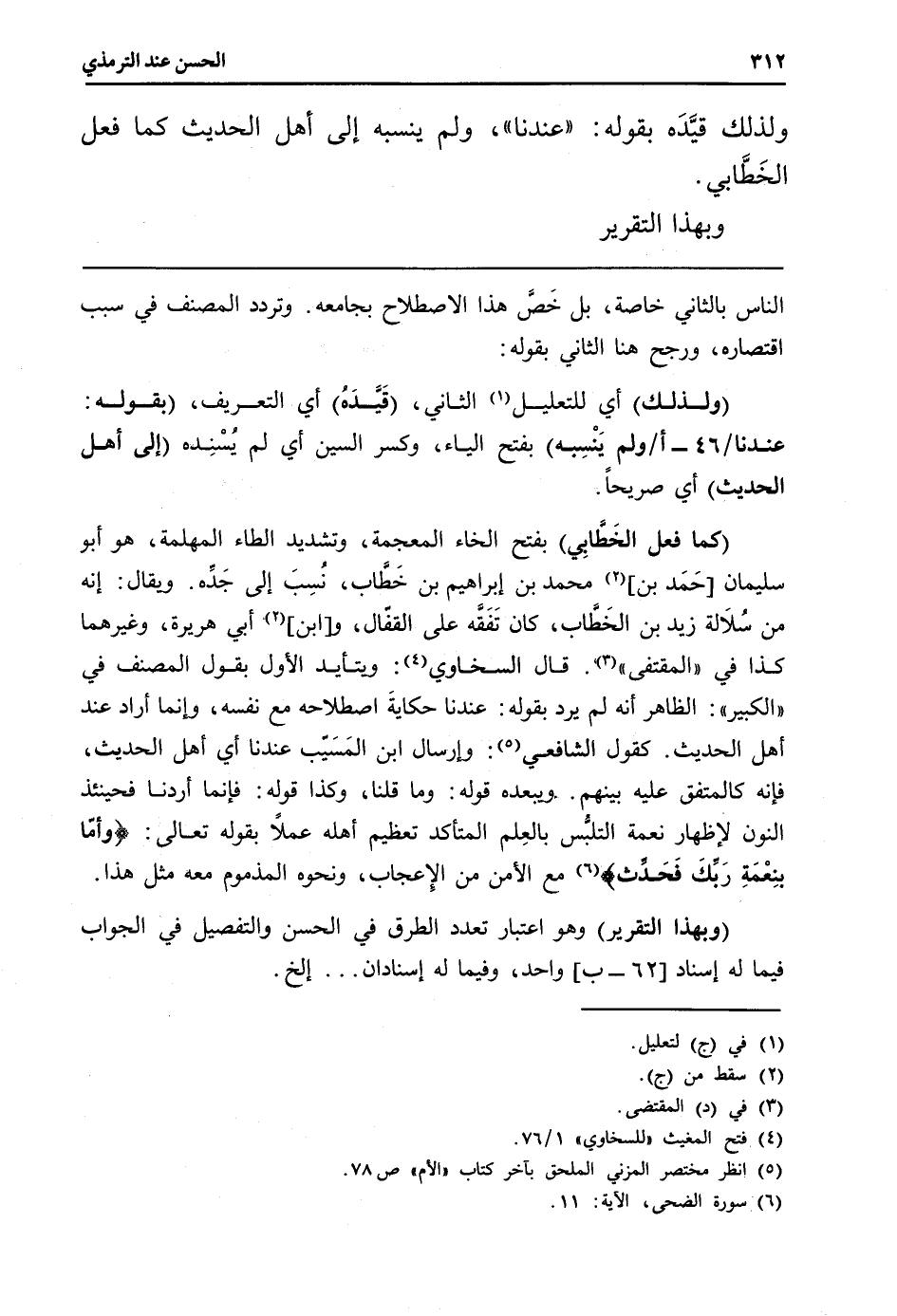 (كَمَا فعل الْخطابِيّ) بِفَتْح الْخَاء الْمُعْجَمَة، وَتَشْديد الطَّاء المهلمة، هُوَ أَبُو سُلَيْمَان [حَمَدَ بن] مُحَمَّد بن إِبْرَاهِيم بن خَطاب، نُسِبَ إِلَى جَده. وَيُقَال: إِنَّه من سلالة زيد بن الخَطاب، كَانَ تفقه على الْقفال، و [ابْن] أبي هُرَيْرَة، وَغَيرهمَا كَذَا فِي " المقتفى ". قَالَ السخاوي: ويتأيد الأول بقول المُصَنّف فِي " الْكَبِير " الظَّاهِر أَنه لم يرد بقوله: عندنَا حِكَايَة اصْطِلَاحه مَعَ نَفسه، وَإِنَّمَا أَرَادَ عِنْد أهل الحَدِيث. كَقَوْل الشَّافِعِي: وإرسال ابْن الْمسيب عندنَا أَي أهل الحَدِيث فَإِنَّهُ كالمتفق عَلَيْهِ بَينهم. ويبعده قَوْله: وَمَا قُلْنَا، وَكَذَا قَوْله: فَإِنَّمَا أردنَا فَحِينَئِذٍ النُّون لإِظْهَار نعْمَة التَّلَبُّس بِالْعلمِ المتأكد تَعْظِيم أَهله عملا بقوله تَعَالَى: {وَأما بِنِعْمَة رَبك فَحدث} مَعَ الْأَمْن من الْإِعْجَاب، وَنَحْوه المذموم مَعَه مثل هَذَا.