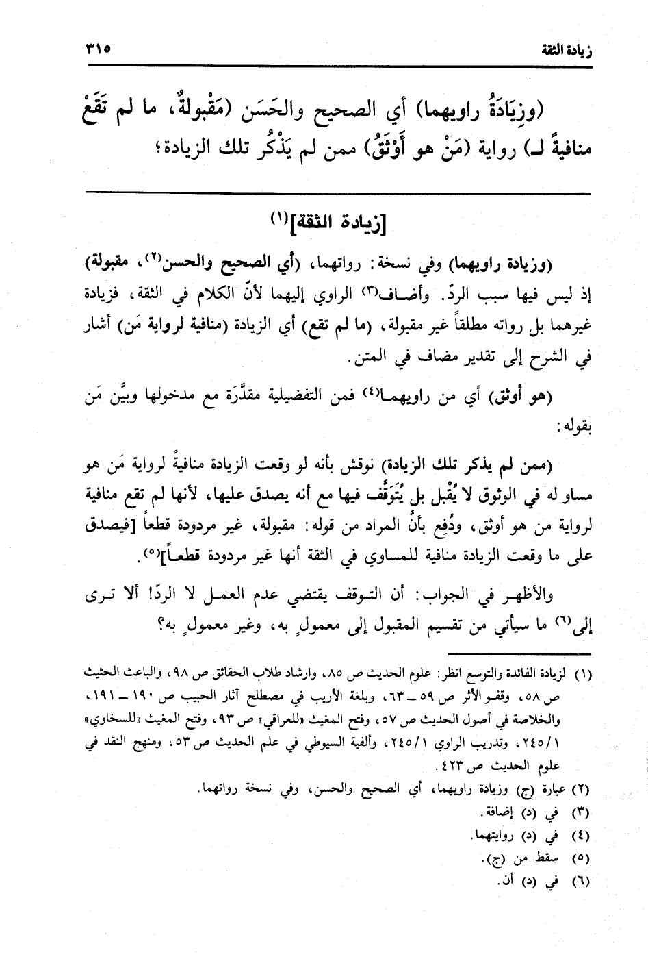 (مِمَّن لم يذكر تِلْكَ الزِّيَادَة) نُوقِشَ بِأَنَّهُ لَو وَقعت الزِّيَادَة مُنَافِيَة لرِوَايَة من هُوَ مسَاوٍ لَهُ فِي الوثوق لَا يُقْبل بل يتَوَقَّف فِيهَا مَعَ أَنه يصدق عَلَيْهَا، لِأَنَّهَا لم تقع مُنَافِيَة لرِوَايَة من هُوَ أوثق، ودُفع بِأَن المُرَاد من قَوْله: مَقْبُولَة، غير مَرْدُودَة قطعا [فَيصدق على مَا وَقعت الزِّيَادَة مُنَافِيَة للمساوي فِي الثِّقَة أَنَّهَا غير مَرْدُودَة قطعا] .