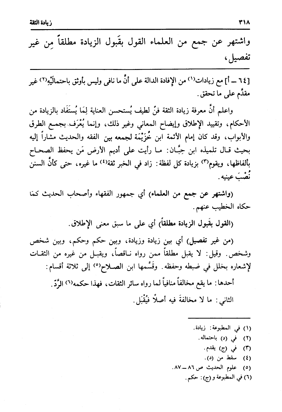 وَأعلم أَن معرفَة زِيَادَة الثِّقَة فن لطيف يستحسن الْعِنَايَة لما يُسْتَفَاد بِالزِّيَادَةِ من الْأَحْكَام، وَتَقْيِيد الْإِطْلَاق وإيضاح الْمعَانِي وَغير ذَلِك، وَإِنَّمَا يُعْرف بِجمع الطّرق الْأَبْوَاب، وَقد كَانَ إِمَام الْأَئِمَّة ابْن خُزَيْمَة لجمعه بَين الْفِقْه والْحَدِيث مشاراً إِلَيْهِ بِحَيْثُ قَالَ تِلْمِيذه ابْن حبَان: مَا رَأَيْت على أَدِيم الأَرْض من يحفظ الصِّحَاح بألفاظها، وَيقوم بِزِيَادَة كل لَفْظَة: زَاد فِي الْخَبَر ثِقَة مَا غَيره، حَتَّى كَأَن السّنَن نُصبَ عَيْنَيْهِ.