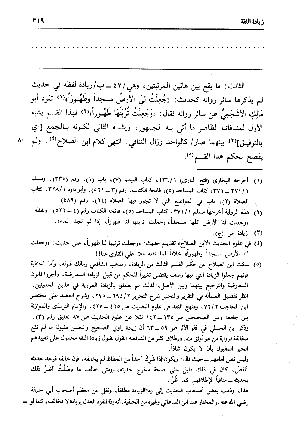الثَّالِث: مَا يَقع بَين هَاتين المرتبين، وَهِي / 47 - ب / زِيَادَة لَفْظَة فِي الحَدِيث لم يذكرهَا سَائِر رُوَاته كَحَدِيث: " جعلت لي الأَرْض مَسْجِدا وَطهُورًا ". تفرد أَبُو مَالك الْأَشْجَعِيّ عَن سَائِر رُوَاته فَقَالَ: " وَجعلت تربَتهَا طهُورا " فَهَذَا الْقسم يشبه الأول لمنافاته لظَاهِر مَا أَتَى بِهِ الْجُمْهُور، وَيُشبه الثَّانِي لكَونه بِالْجمعِ [أَي بالتوفيقٍ] بَينهمَا صَار / كالواحد وَزَالَ التَّنَافِي. انْتهى كَلَام ابْن الصّلاح. وَلم يفصح بِحكم هَذَا الْقسم.