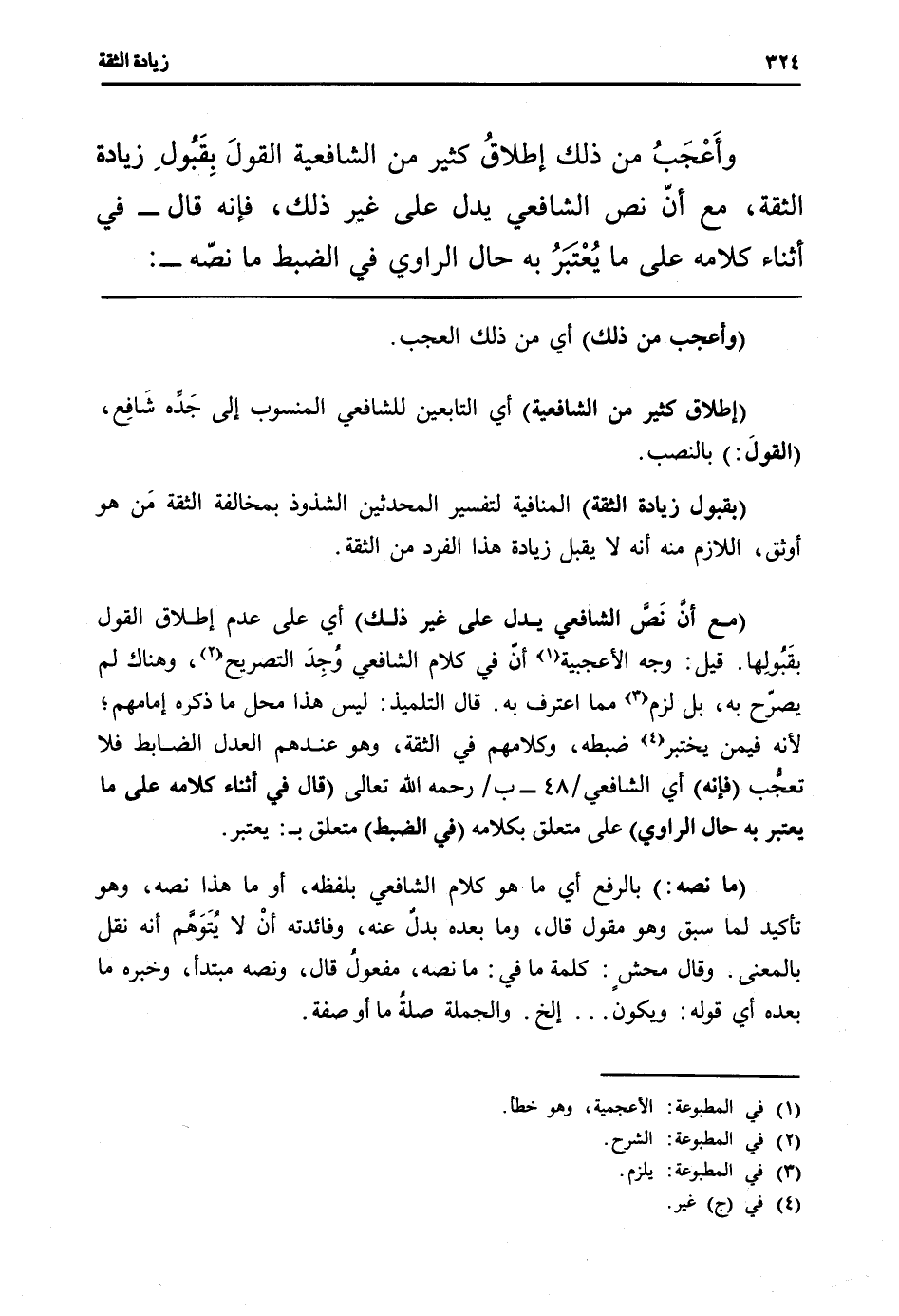 (بِقبُول زِيَادَة الثِّقَة) المنافية لتفسير الْمُحدثين الشذوذ بمخالفة الثِّقَة من هُوَ أوثق، اللَّازِم مِنْهُ أَنه لَا يقبل زِيَادَة هَذَا الْفَرد من الثِّقَة.