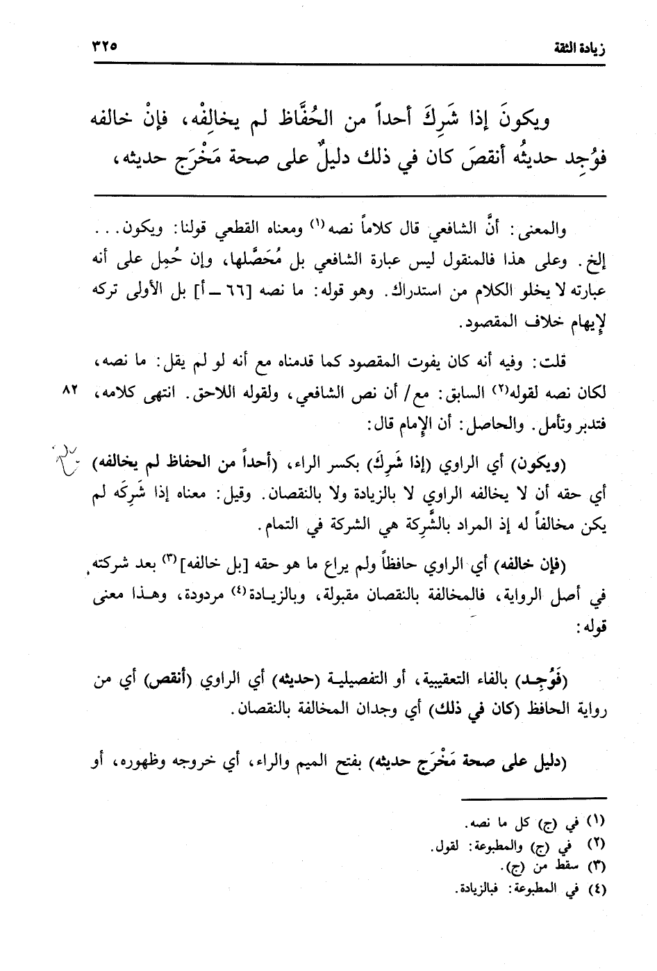 (وَيكون) أَي الرَّاوِي (إِذا شرك) بِكَسْر الرَّاء، (أحدا من الْحفاظ لم يُخَالِفهُ) أَي حَقه أَن لَا يُخَالِفهُ الرَّاوِي لَا بِالزِّيَادَةِ وَلَا بِالنُّقْصَانِ. وَقيل: مَعْنَاهُ إِذا شركه لم يكن مُخَالفا لَهُ إِذْ المُرَاد بِالشّركَةِ هِيَ الشّركَة فِي التَّمام.