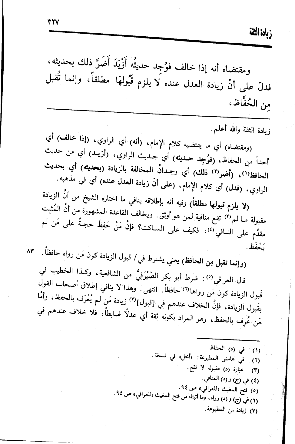(وَإِنَّمَا تقبل من الْحَافِظ) يَعْنِي يشْتَرط فِي / قبُول الزِّيَادَة كَون من رَوَاهُ حَافِظًا. قَالَ الْعِرَاقِيّ: شَرط أَبُو بكر الصَّيْرَفِي من الشَّافِعِيَّة، وَكَذَا الْخَطِيب فِي قبُول الزِّيَادَة كَون من رَوَاهَا حَافِظًا. انْتهى. وَهَذَا لَا يُنَافِي إِطْلَاق أَصْحَاب القَوْل بِقبُول الزِّيَادَة، فَإِن الْخلاف عِنْدهم فِي [قبُول] زِيَادَة من لم يعرف بِالْحِفْظِ، وَأما من عرف بِالْحِفْظِ، وَهُوَ المُرَاد بِكَوْنِهِ ثِقَة أَي عدلا ضابطا، فَلَا خلاف عِنْدهم فِي