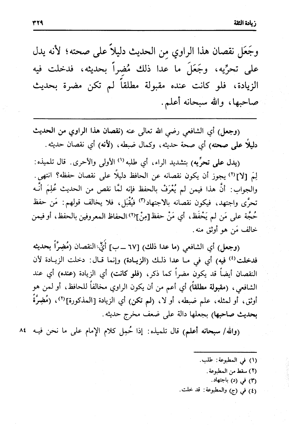 (وَجعل) أَي الشَّافِعِي (مَا عدا ذَلِك) [67 - ب] أَي النُّقْصَان (مضرا بحَديثه فَدخلت فِيهِ) أَي فِي مَا عدا ذَلِك (الزِّيَادَة) وَإِنَّمَا قَالَ: دخلت الزِّيَادَة لِأَن النُّقْصَان أَيْضا يكون مضرا كَمَا ذكر، (فَلَو كَانَت) أَي الزِّيَادَة (عِنْده) أَي عِنْد الشَّافِعِي، (مَقْبُولَة مُطلقًا) أَي أَعم من أَن يكون الرَّاوِي مُخَالفا لِلْحَافِظِ، أَو لمن هُوَ أوثق، أَو لمثله، علم ضَبطه، أَو لَا، (لم تكن) أَي الزِّيَادَة [الْمَذْكُورَة] ، (مضرَّة بِحَدِيث صَاحبهَا) بجعلها دَالَّة على ضعف مخرج حَدِيثه.