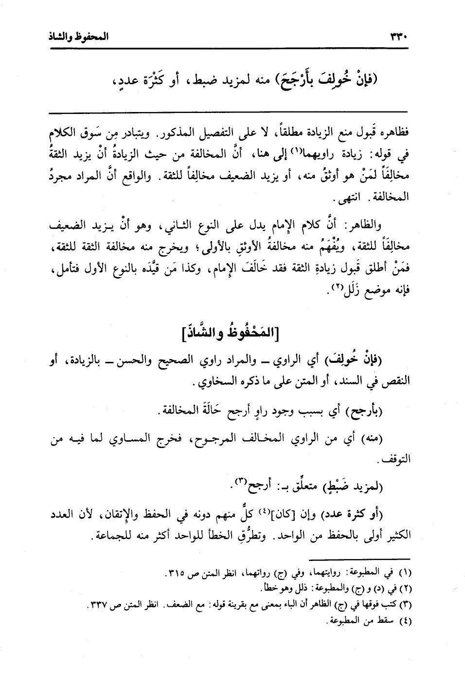 (فَإِن خُولِفَ) أَي الرَّاوِي - وَالْمرَاد رَاوِي الصَّحِيح وَالْحسن - بِالزِّيَادَةِ، أَو النَّقْص فِي السَّنَد، أَو الْمَتْن على مَا ذكره السخاوي.