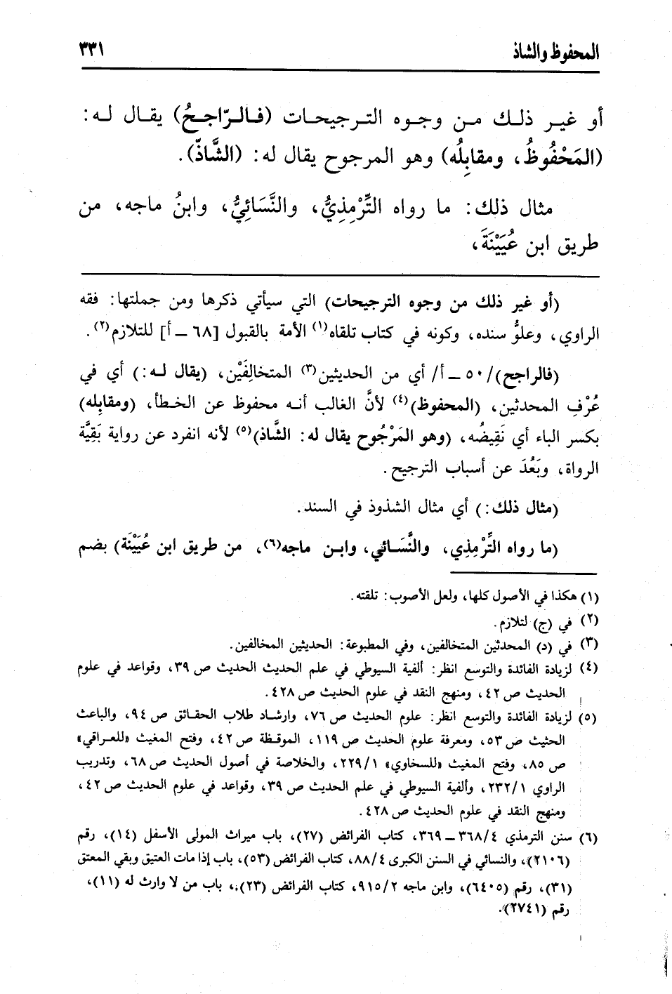 (أَو غير ذَلِك من وُجُوه الترجيحات) الَّتِي سَيَأْتِي ذكرهَا وَمن جُمْلَتهَا: فقه الرَّاوِي، وعلو سَنَده، وَكَونه فِي كتاب تَلقاهُ الْأمة بِالْقبُولِ [68 - أ] للتلازم. (فالراجح) / 50 - أ / أَي من الْمُحدثين المتخالفين، (يُقَال لَهُ:) أَي فِي عرف الْمُحدثين، (الْمَحْفُوظ) لِأَن الْغَالِب أَنه مَحْفُوظ عَن الْخَطَأ، (وَمُقَابِله) بِكَسْر الْبَاء أَي نقيضه، (وَهُوَ الْمَرْجُوح يُقَال لَهُ: الشاذ) لِأَنَّهُ انْفَرد عَن رِوَايَة بَقِيَّة الروَاة، وَبعد عَن أَسبَاب التَّرْجِيح.