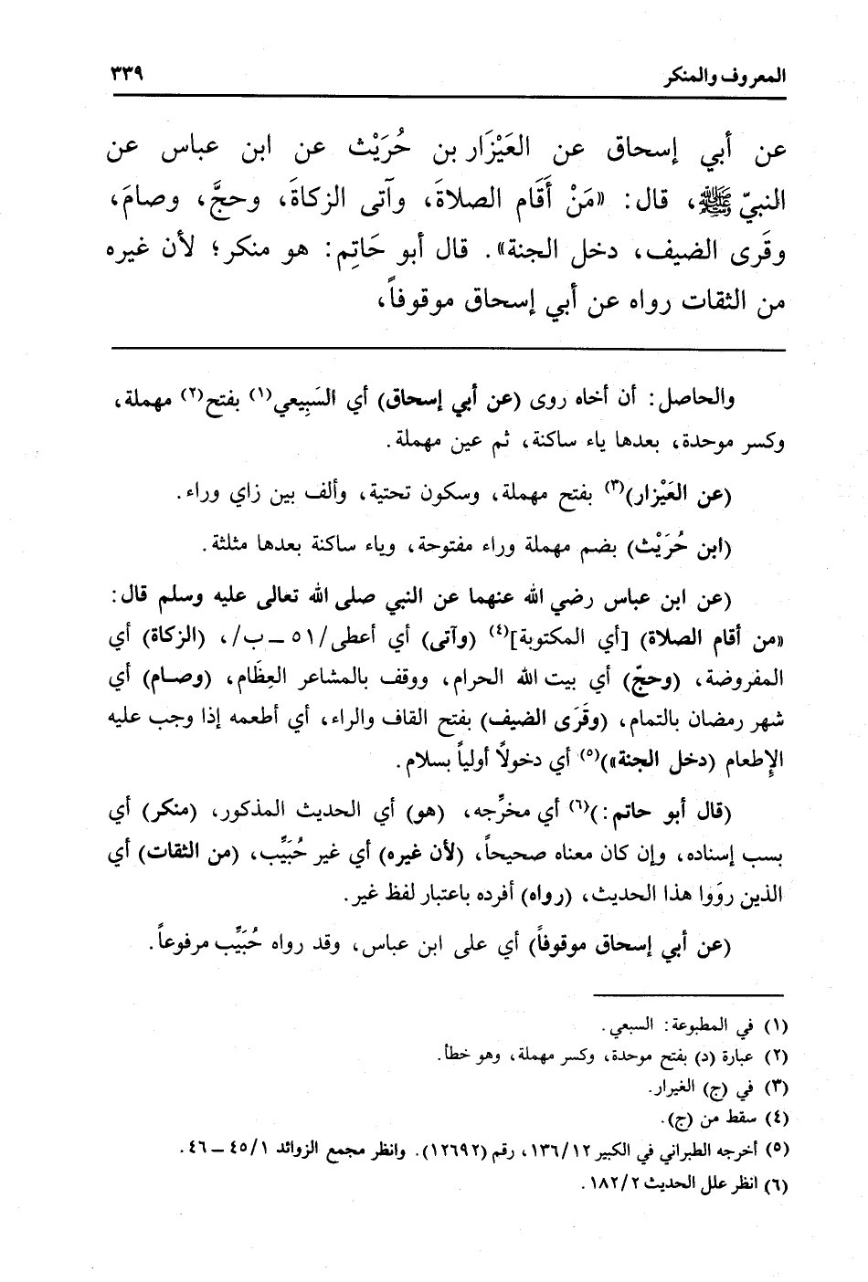 (قَالَ أَبُو حَاتِم:) أَي مخرجه، (هُوَ) أَي الحَدِيث الْمَذْكُور، (مُنكر) أَي بِسَبَب إِسْنَاده، وَإِن كَانَ مَعْنَاهُ صَحِيحا، (لِأَن غَيره) أَي غير حبيب، (من الثِّقَات) أَي الَّذِي رووا هَذَا الحَدِيث، (رَوَاهُ) أفرده بِاعْتِبَار لفظ غير.