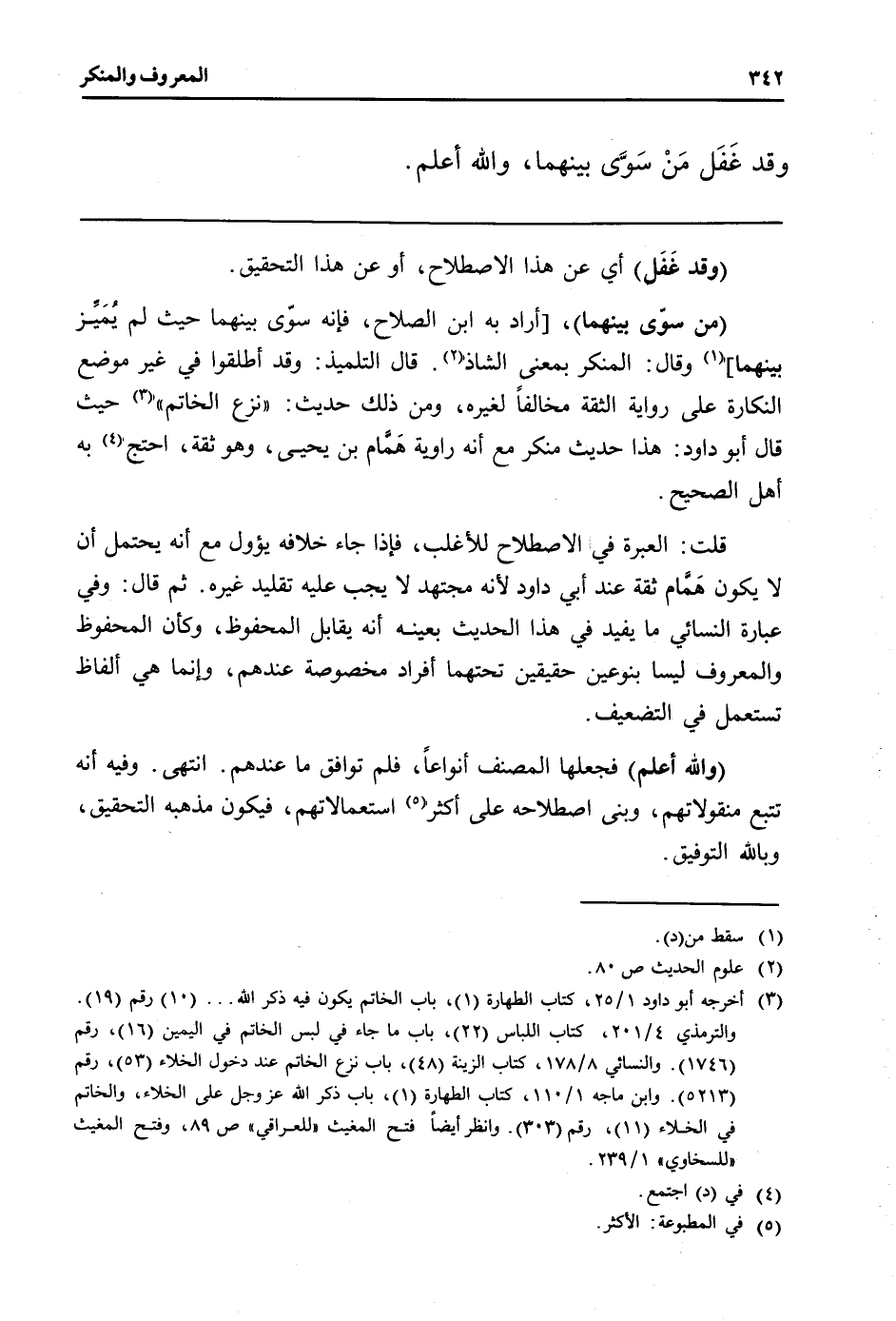 (من سوىّ بَينهمَا) ، [أَرَادَ بِهِ ابْن الصّلاح، فَإِنَّهُ سّوى بَينهمَا حَيْثُ لم يُمّيز بَينهمَا] وَقَالَ: الْمُنكر بِمَعْنى الشاذ. قَالَ التلميذ: وَقد أطْلقُوا فِي غير مَوضِع النكارة على رِوَايَة الثِّقَة مُخَالفا لغيره، وَمن ذَلِك حَدِيث: " نزع الْخَاتم " حَيْثُ قَالَ أَبُو دَاوُد: هَذَا حَدِيث مُنكر مَعَ أَنه راوية هّمّام بن يحيى، وَهُوَ ثِقَة، احْتج بِهِ أهل الصَّحِيح.