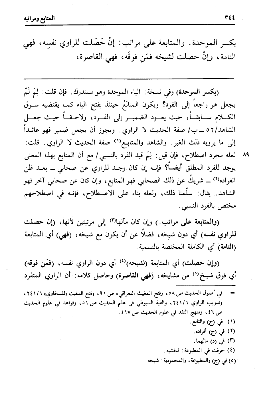 (بِكَسْر الْمُوَحدَة) وَفِي نُسْخَة: الْبَاء الْمُوَحدَة وَهُوَ مُسْتَدْرك. فَإِن قلت: لِم لَمْ يَجْعَل هُوَ رَاجعا إِلَى الْفَرد؟ وَيكون المتابعُ حِينَئِذٍ بِفَتْح الْبَاء كَمَا يَقْتَضِيهِ سوق الْكَلَام سَابِقًا، حَيْثُ يعود الضَّمِير إِلَى الْفَرد، ولاحقاً حَيْثُ جعل الشَّاهِد / 52 - ب / صفة الحَدِيث لَا الرَّاوِي. وَيجوز أَن يَجْعَل ضمير فَهُوَ عَائِدًا إِلَى مَا يرويهِ ذَلِك الْغَيْر. وَالشَّاهِد والمتابع صفة الحَدِيث لَا الرَّاوِي. قلت: لَعَلَّه مُجَرّد اصْطِلَاح، فَإِن قيل: لِمَ قيد الْفَرد بالنسبي / مَعَ أَن المتابع بِهَذَا الْمَعْنى يُوجد للفرد الْمُطلق أَيْضا؟ فَإِنَّهُ إِن كَانَ وجد للراوي عَن صَحَابِيّ - بعد ظن انْفِرَاده - شريكٌ عَن ذَلِك الصَّحَابِيّ فَهُوَ المتابع، وَإِن كَانَ عَن صَحَابِيّ آخر فَهُوَ الشَّاهِد. يُقَال: سلّمنا ذَلِك، وَلَعَلَّه بِنَاء على الِاصْطِلَاح، فَإِنَّهُ فِي اصطلاحهم مُخْتَصّ بالفرد النسبي.