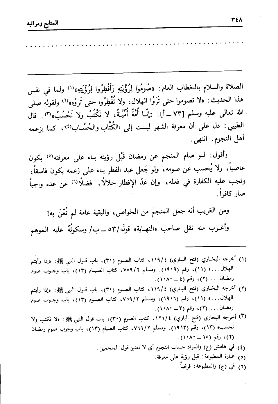 الصَّلَاة وَالسَّلَام بِالْخِطَابِ الْعَام: " صُومُوا لِرُؤْيَتِه وَأَفْطِرُوا لِرُؤْيَتِه " وَلما فِي نفس هَذَا الحَدِيث: " لَا تَصُومُوا حَتَّى تَرَوُا الْهلَال، وَلَا تُفْطِرُوا حَتَّى تَرَوْه " وَلقَوْله [صلى الله عَلَيْهِ وَسلم] [73 - أ] " إنّا أُمهٌ أُميّةٌ، لَا نَكْتُبُ وَلَا نَحْسُبُ ". قَالَ الطبيي: دلّ على أَن معرفَة الشَّهْر لَيست إِلَى الكُتّاب والحُسّاب، كَمَا يزعمه أهل النُّجُوم. انْتهى.