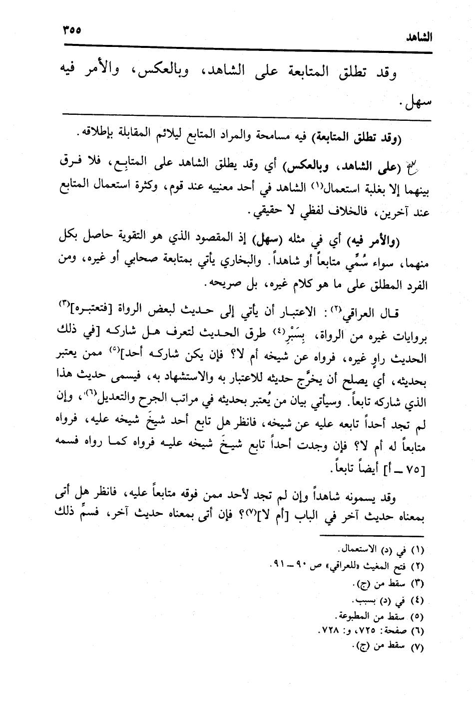 قَالَ الْعِرَاقِيّ: الِاعْتِبَار أَن يَأْتِي إِلَى حَدِيث لبَعض الروَاة [فتعتبره] بروايات غَيره من الروَاة، بِسَبرِ طرق الحَدِيث لتعرف هَل شَاركهُ [فِي ذَلِك الحَدِيث راوٍ غَيره، فَرَوَاهُ عَن شَيْخه أم لَا؟ فَإِن يكن شَاركهُ أحد] مِمَّن يعْتَبر بحَديثه، أَي يصلح أَن يخرج حَدِيثه للاعتبار بِهِ والاستشهاد بِهِ، فيسمى حَدِيث هَذَا الَّذِي شَاركهُ تَابعا. وَسَيَأْتِي بَيَان من يُعتبر بحَديثه فِي مَرَاتِب الْجرْح وَالتَّعْدِيل، وَإِن لم تَجِد أحدا تَابعه عَلَيْهِ عَن شَيْخه، فَانْظُر هَل تَابع أحد شيخَ شَيْخه عَلَيْهِ، فَرَوَاهُ مُتَابعًا لَهُ أم لَا؟ فَإِن وجدت أحدا تَابع شيخَ شَيْخه عَلَيْهِ فَرَوَاهُ كَمَا رَوَاهُ فسمه [75 - أ] أَيْضا تَابعا.
