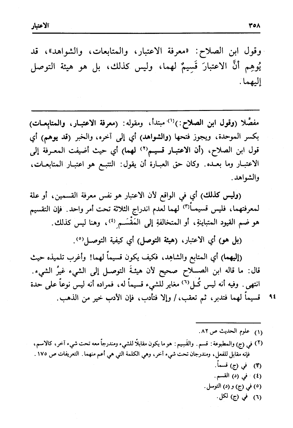 مفصلا (وَقَول ابْن الصّلاح) مُبْتَدأ، ومقوله: (معرفَة الِاعْتِبَار، والمتابِعات) بِكَسْر الْمُوَحدَة، وَيجوز فتحهَا (والشواهد) أَي إِلَى آخِره، وَالْخَبَر (قد يُوهم) أَي قَول ابْن الصّلاح، (أَن الِاعْتِبَار قسيم لَهما) أَي حَيْثُ أضيفت الْمعرفَة إِلَى الِاعْتِبَار وَمَا بعده. وَكَانَ حق الْعبارَة أَن يَقُول: التتبع هُوَ اعْتِبَار المتابعات، والشواهد.