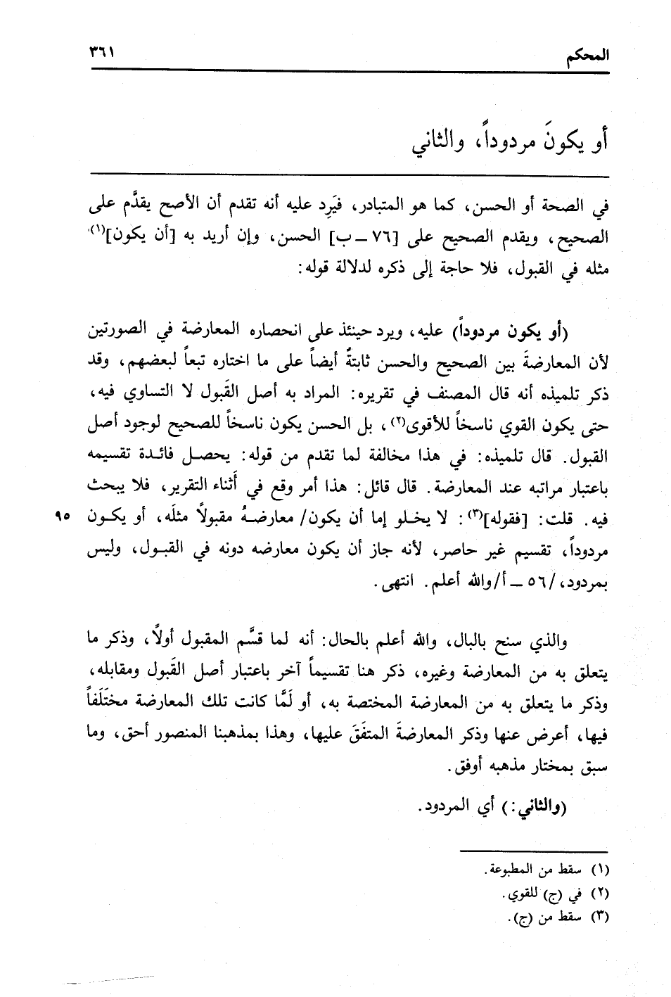 (أَو يكون مردوداً) عَلَيْهِ، وَيرد حِينَئِذٍ على انحصاره الْمُعَارضَة فِي الصُّورَتَيْنِ لِأَن الْمُعَارضَة بَين الصَّحِيح وَالْحسن ثابتةٌ أَيْضا على مَا اخْتَارَهُ تبعا لبَعْضهِم، وَقد ذكر تِلْمِيذه أَنه قَالَ المُصَنّف فِي تَقْرِيره: المُرَاد بِهِ أصل القَبول لَا التَّسَاوِي فِيهِ، حَتَّى يكون الْقوي نَاسِخا للأقوى، بل الْحسن يكون نَاسِخا للصحيح لوُجُود أصل الْقبُول. قَالَ تِلْمِيذه: فِي هَذَا مُخَالفَة لما تقدم من قَوْله: يحصل فَائِدَة تقسيمه بِاعْتِبَار مراتبه عِنْد الْمُعَارضَة. قَالَ قَائِل: هَذَا أَمر وَقع فِي أَثناء التَّقْرِير، فَلَا يبْحَث فِيهِ. قلت: [فَقَوله] : لَا يَخْلُو إِمَّا أَن يكون / معارضهٌ مَقْبُولًا مثلَه، أَو يكون مردوداً، تَقْسِيم غير حاصر، لِأَنَّهُ جَازَ أَن يكون معارضه دونه فِي الْقبُول، وَلَيْسَ بمردود، / 56 - أ / وَالله أعلم. انْتهى.
